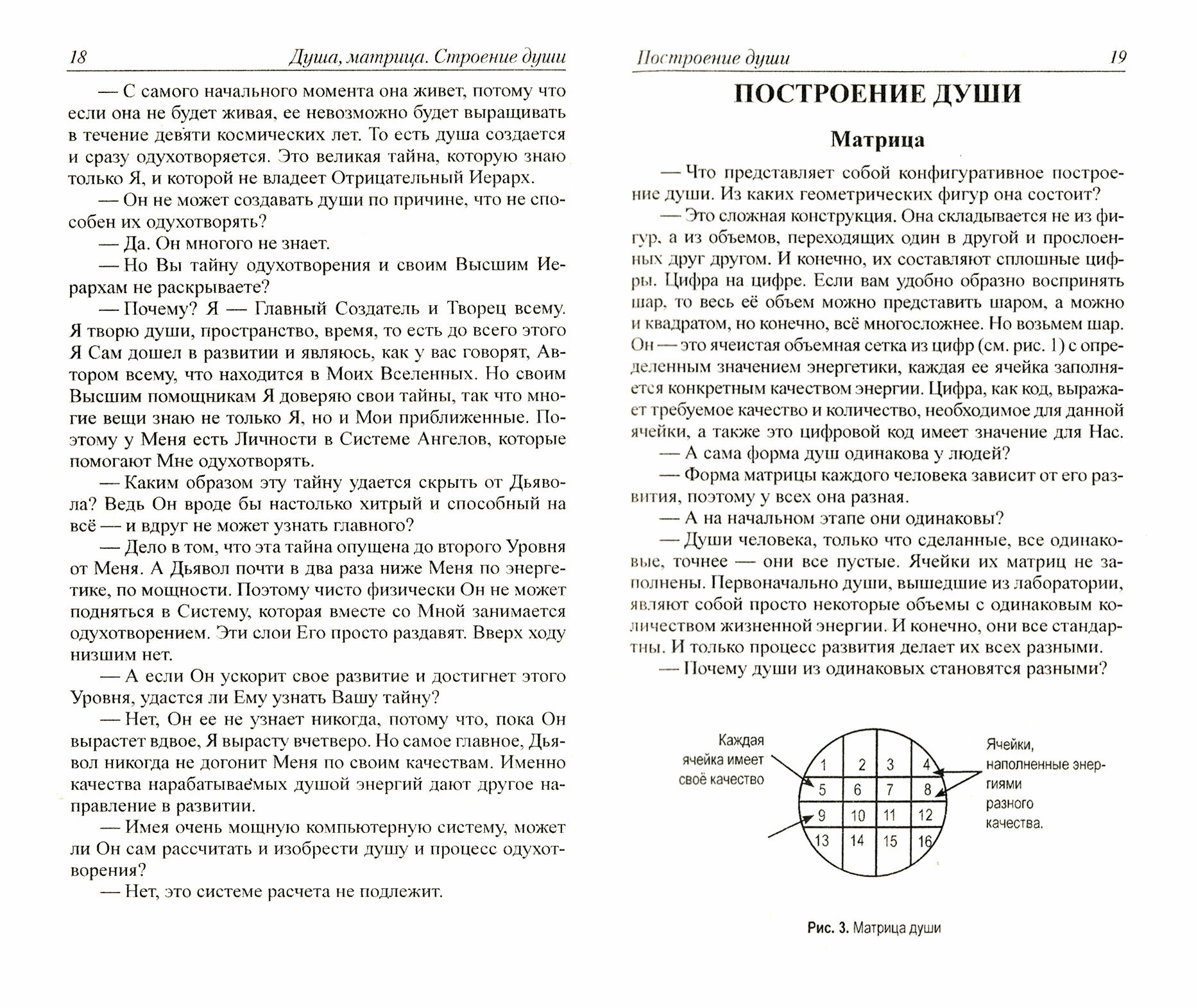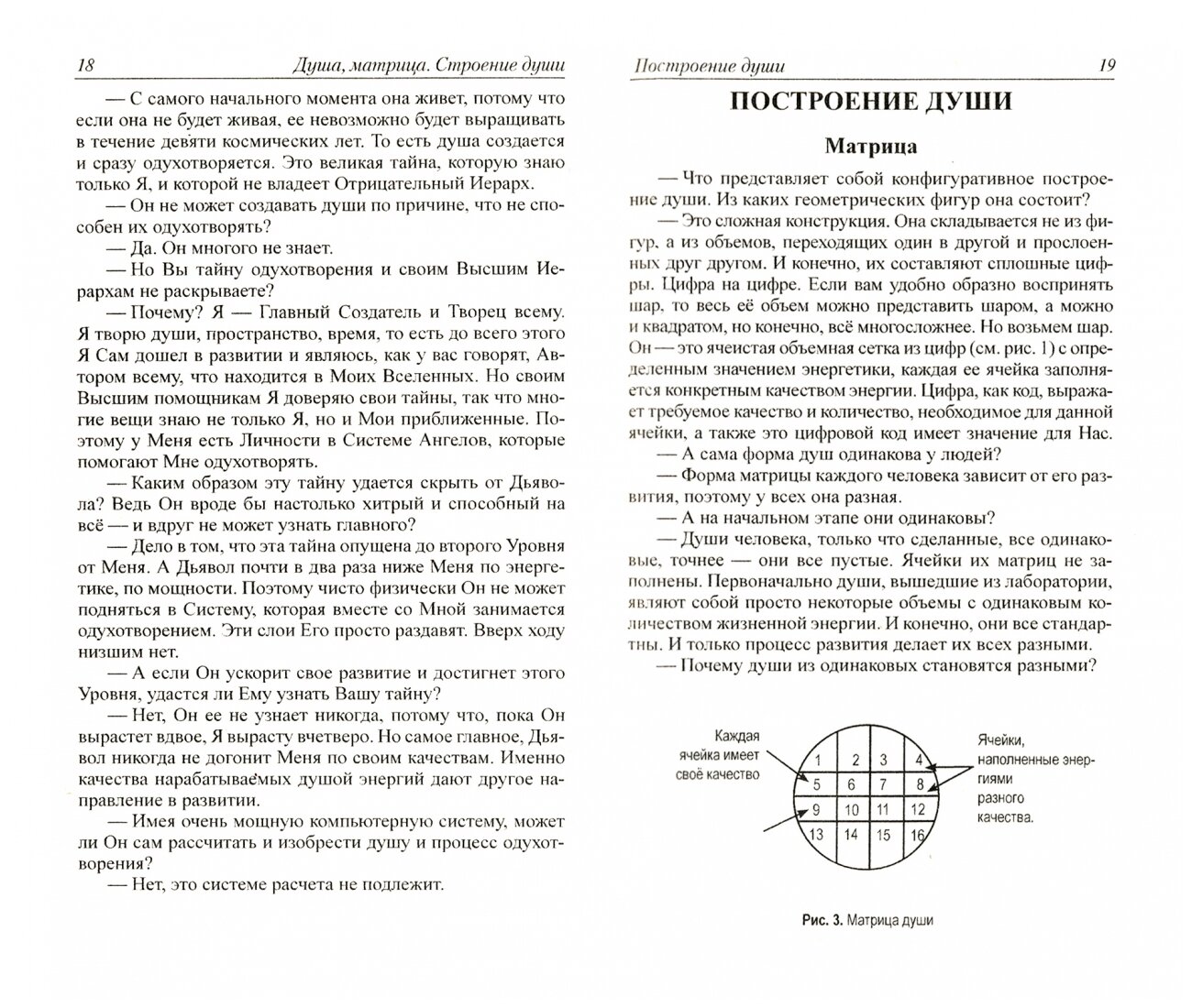 То, что эта книга выдержала вот уже тринадцатое переиздание, безусловно, доказывает ее актуальность и востребованность. В ней рассматривается множество важнейших вопросов, таких как Многогранность истины, Душа, матрица. Строение души, Создание души, Триединство души, Болезнь матрицы. Деградация, Время и матрица, Матрицы разных форм, Развитие души, Разные пути совершенствования, За что ценят души, Покупка душ, Свобода для душ, Эксперименты земных учёных с душой, Неизвестный мозг человека. Центр - мозг или импульсное кольцо. Мозг пола. Мозг крови, Построение и работа импульсного кольца, Центр-мозг в период смерти, Немного о физическом мозге, Процесс мышления, Мыслеформы, Типы мышления других форм жизни, Уровни развития, Память, Сознание, подсознание, Озарение. Космическое сознание, Коллективное сознание, Управление обществом эгрегоры, Развитие по программе жизни, Что представляет собой программа, Энергодолги, Типы программ человека, Составление программ, Программы на сны, Программа на смерть, Программы у Бога и у Дьявола, Программы Определителей Земли и прочие, Программы Земли, Карма, или Закон причинно-следственной связи, Грех, Конкретная карма, Карма за убийство, Убийство животных, Карма рода, коллектива, нации, Покаяние, Карма в будущем, Сон и сновидения, Для чего дан сон человеку, Воспитание во сне, Информация, получаемая во снах, Формирование сновидений, Вылет души из тела во время сна, Люди, не видящие снов, Вещие сны, Сны из прошлого. Цветные сны, Летаргический сон, Тайна смерти человека, Раскодирование, Распределение душ после смерти, Параллельные миры Земли. Плазмоиды, Антиразум, Миры грубее земного, Инопланетяне, Информационное поле Земли, Передача информации вниз и другие. Для всех, интересующихся эзотерическими знаниями.