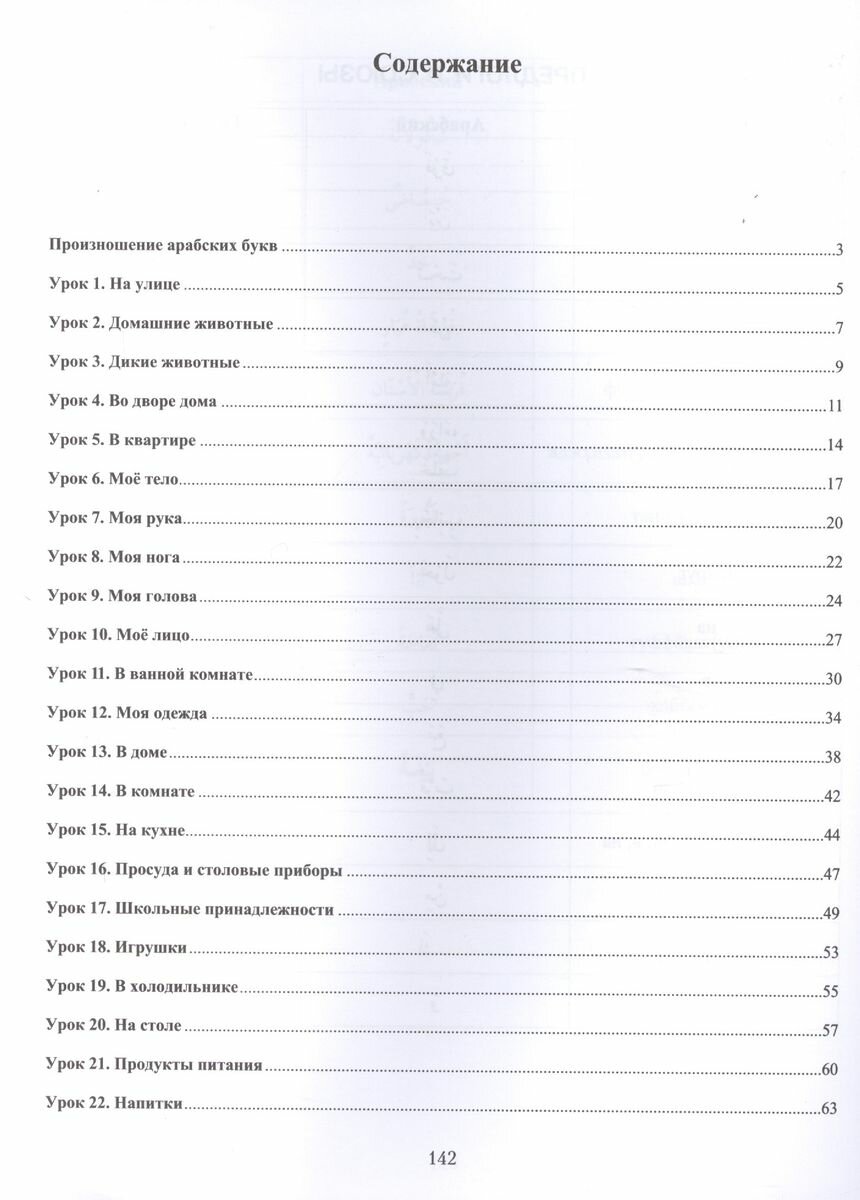 Пособие вполне отвечает заявленной в аннотации помощи в изучении слов и составлении предложений. Пособие состоит из 36 тематических уроков. В каждом уроке даётся определённый набор слов (со всем огласовками) и упражнения к ним. Слова даны без транскрипции, но в конце пособия есть словарик, где в алфавитном порядке представлены слова, их перевод и транскрипция кириллицей. Во многих уроках помимо существительных даны глаголы с их спряжением в прошедшем и настоящем времени, и иногда к этому добавлена форма императива. Это действительно помогает усваивать строение арабского предложения.