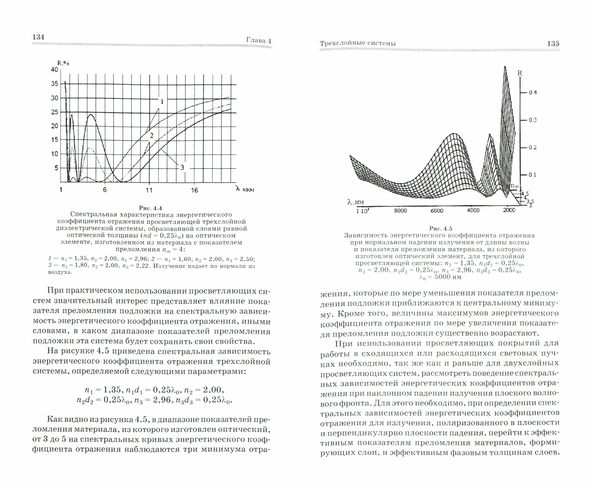 Гриф УМО, для ВПО. Рассмотрен широкий круг вопросов, посвященных сведениям о методах расчета спектральных характеристик многослойных систем, образованных прозрачными, непрозрачными и слабо поглощающими слоями. Большое внимание уделено оптическим характеристикам однослойных, двухслойных, трехслойных и многослойных систем, используемых в качестве просветляющих, зеркальных, спектроделительных, зеркальных и фильтрующих интерференционных покрытий. Дано представление о влиянии угла наклона падающего излучения на характер изменения спектральных коэффициентов отражения и пропускания. Учебник предназначен для студентов высших учебных заведений, обучающихся по направлениям подготовки "Оптотехника", "Лазерная техника и лазерные технологии", "Фотоника и оптоинформатика" и другим физическим и технологическим направлениям подготовки.