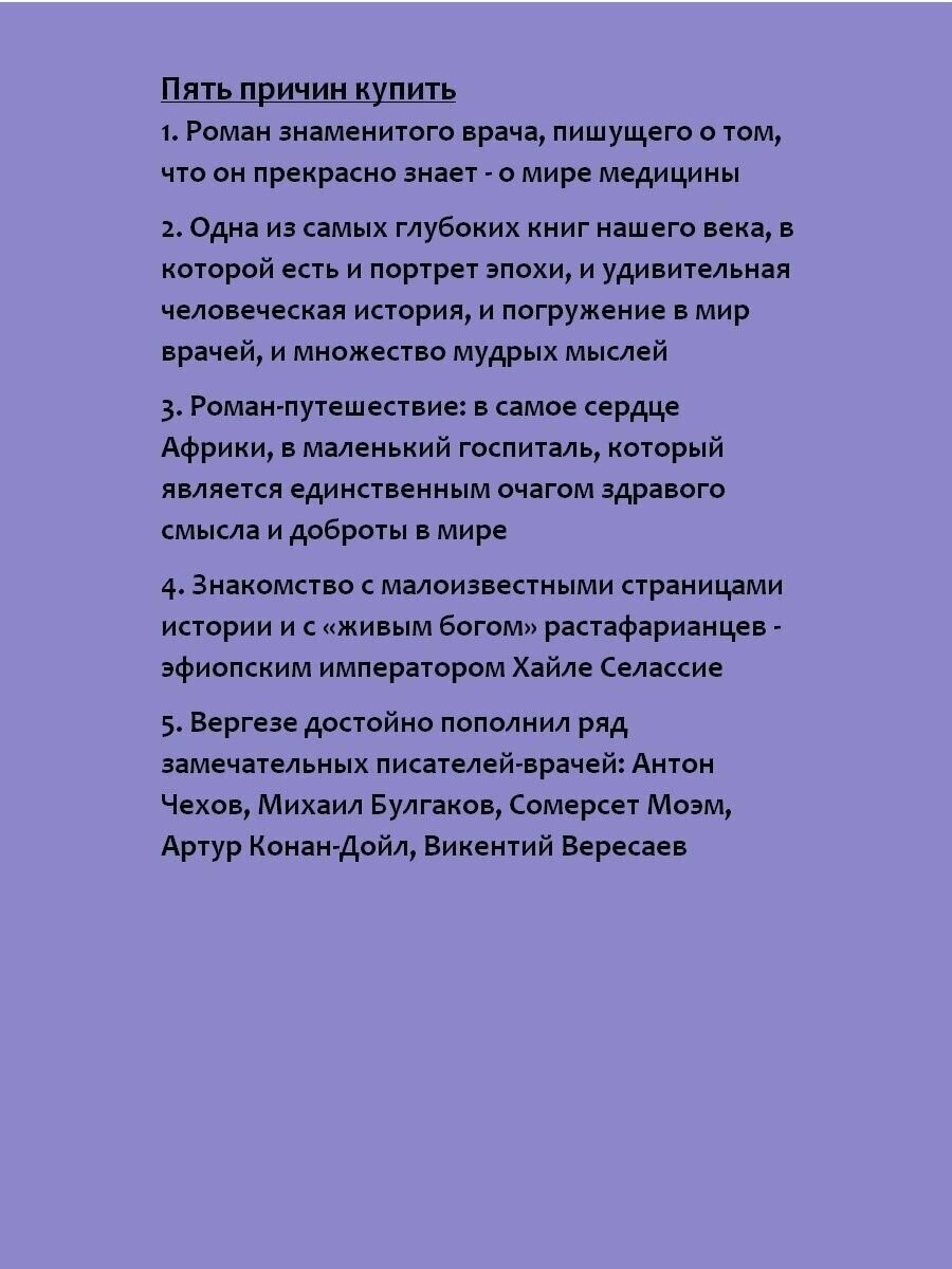 Абрахам Вергезе - выдающий доктор, светило в области физиотерапии, один из самых авторитетных врачей Америки. Его первый роман стал большим событием, удивительная проникновенность и достоверность, глубочайшее знание профессии и великолепный литературный стиль позволяют назвать книгу Вергезе одним из самых значительных медицинских романов последнего столетия.