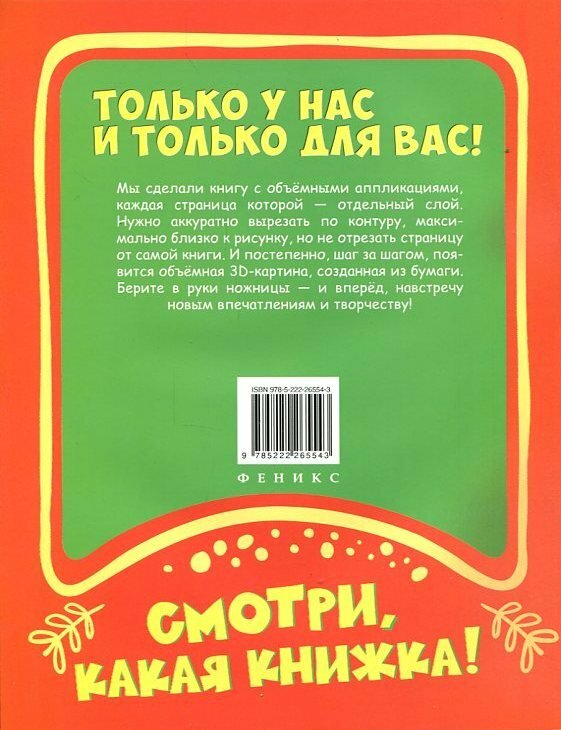 Только у нас и только для вас! Самые необычные аппликации, которые вы когда-либо видели. Никакого клея! Уже перелистываете страницы, пытаясь разгадать, что там за секрет? Сейчас всё объясним. Мы сделали книгу с объёмными аппликациями, каждая страница которой — отдельный слой. Нужно аккуратно вырезать по контуру, максимально близко к рисунку, но не отрезать страницу от самой книги. И постепенно, шаг за шагом, появится объёмная ЗD-картина. созданная из бумаги. Берите в руки ножницы — и вперёд, навстречу новым впечатлениям и творчеству!