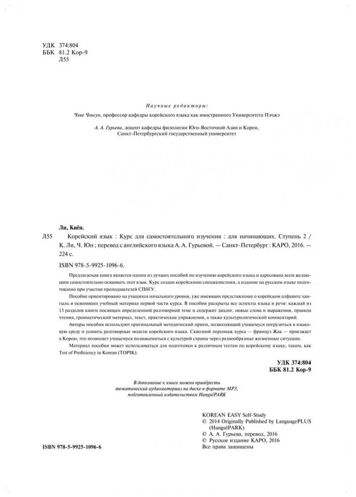 Предлагаемая книга является одним из лучших пособий по изучению корейского языка и адресована всем желающим самостоятельно осваивать этот язык. Курс создан корейскими специалистами, а издание на русском языке подготовлено при участии преподавателей СПбГУ.