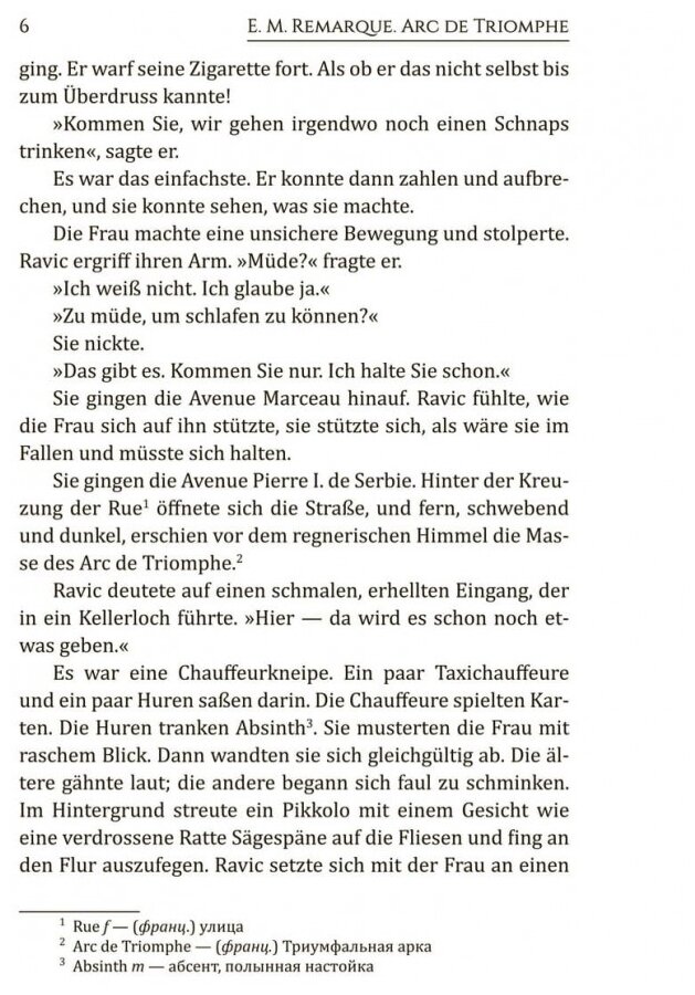 Замечательная книга! Перечитываю уже 3 раз и многим подружкам дарила. Очень хороший, классический немецкий, читается легко, потому что много диалогов. Чуть ли ни в каждом абзаце афоризмы, которые хочется подчёркивать и выписывать. Начала читать по немецкий именно с книг Ремарка. Всем рекомендую!