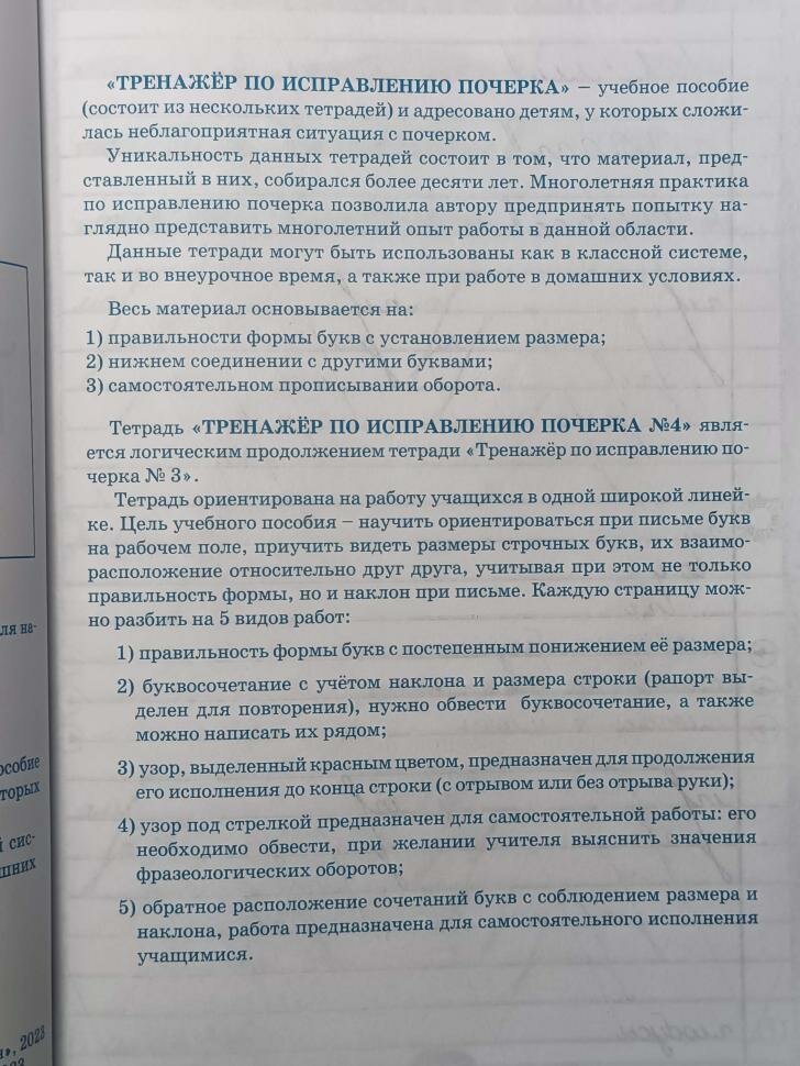 "Тренажёр по исправлению почерка" - учебное пособие (состоит из нескольких тетрадей) и адресовано детям, у которых сложилась неблагоприятная ситуация с почерком. Данные тетради могут быть использованы как в классной системе, так и во внеурочное время, а также при работе в домашних условиях.