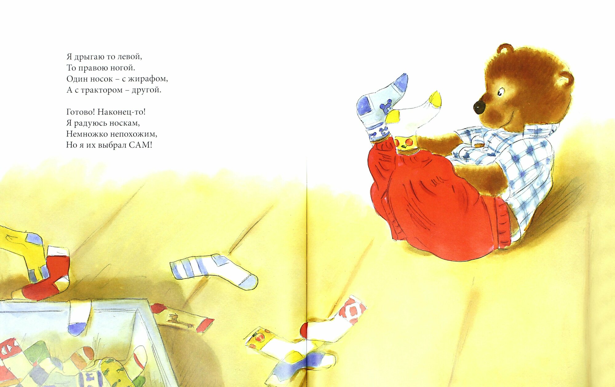 Есть, к сожалению, в книжке небольшие огрехи. Взрослый не сможет не заметить опечатку в самом стихотворении, о которой уже написала lunar squirrel, и отсутствие пробела между цифрой и словом в статье о Сергее Махотине. От внимательного ребёнка не ускользнут два момента: поэт пишет о том, что медвежонок надевает носок с жирафом, а на иллюстрации художника – носок с яблоками, у Сергея Махотина медвежонок самостоятельно завязал шнурки на ботинках, а, судя по рисунку, он так и не одолел эту сложную науку… Но эти маленькие недочёты не умаляют достоинств издания, книжка очень-очень славная!