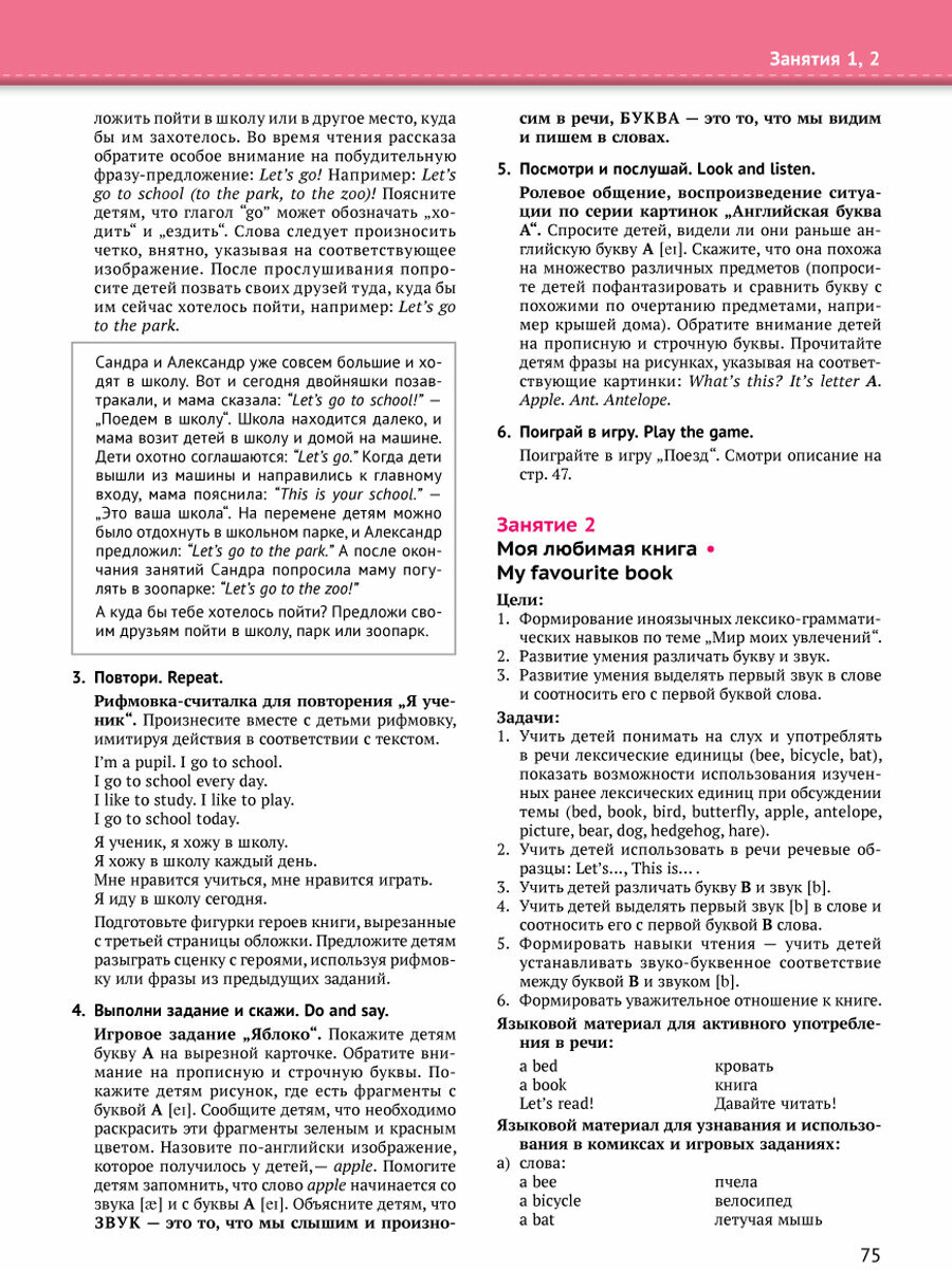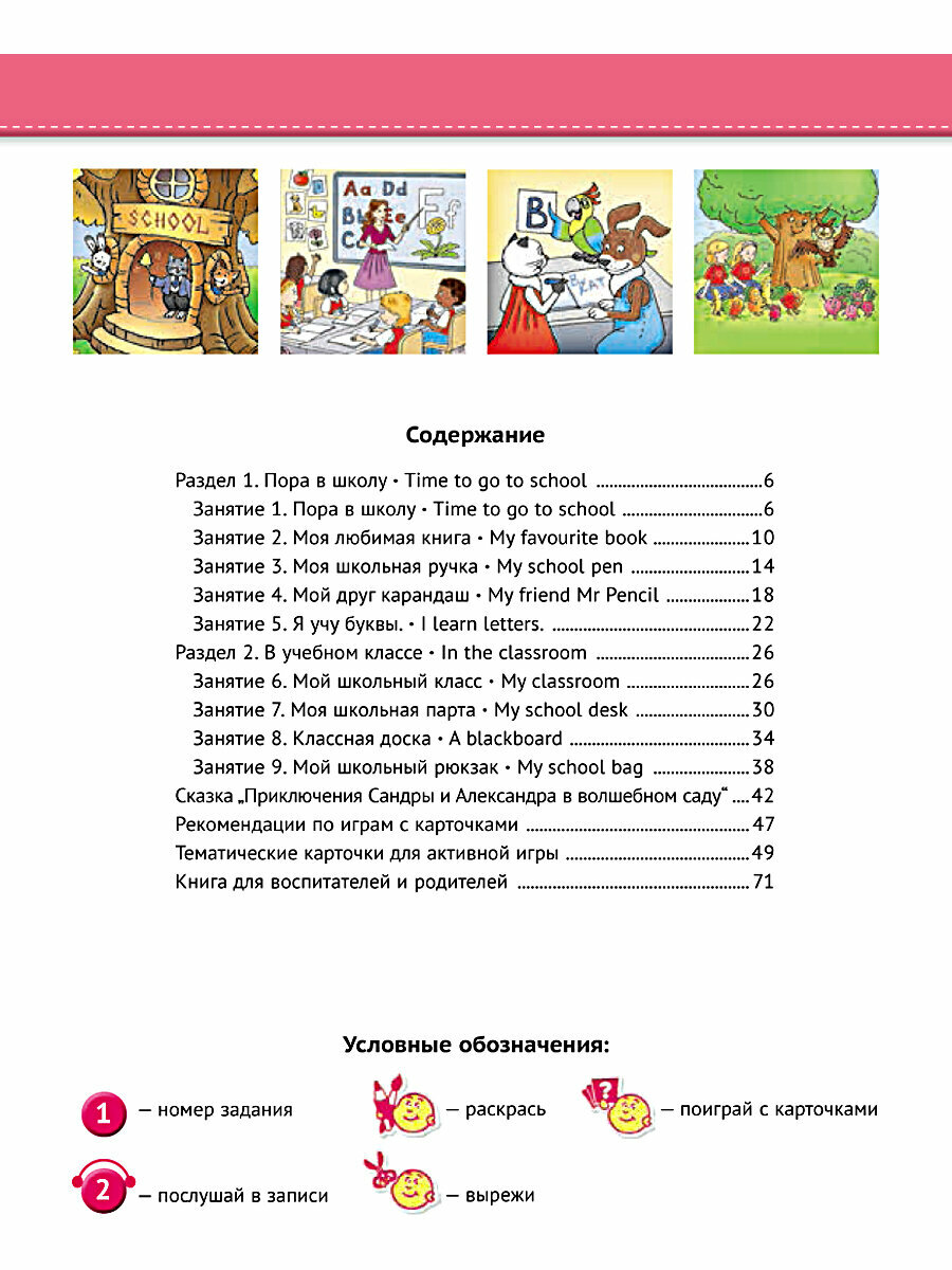 Курс "12 шагов к английскому языку" состоит из 12 частей и Программы курса. Книги содержат занимательные задания, игры, материалы для раскрашивания, вырезные маски, паззлы и комиксы, позволяющие ребенку начать знакомиться с основами английского языка, правилами поведения и азами культуры различных стран. Аудиоприложение поможет детям научиться воспринимать англоязычную речь на слух. Аудиоприложение можно скачать по ссылке и по QR-коду на обложке. Материалы курса способствуют как общему, так и языковому развитию ребенка. Курс создан в рамках федерального государственного образовательного стандарта дошкольного образования (ФГОС ДО). Каждая часть курса включает книгу для воспитателей и родителей с подробными методическими рекомендациями по проведению занятий. С ее помощью заниматься английским языком с детьми смогут как педагоги, так и родители, дедушки и бабушки.