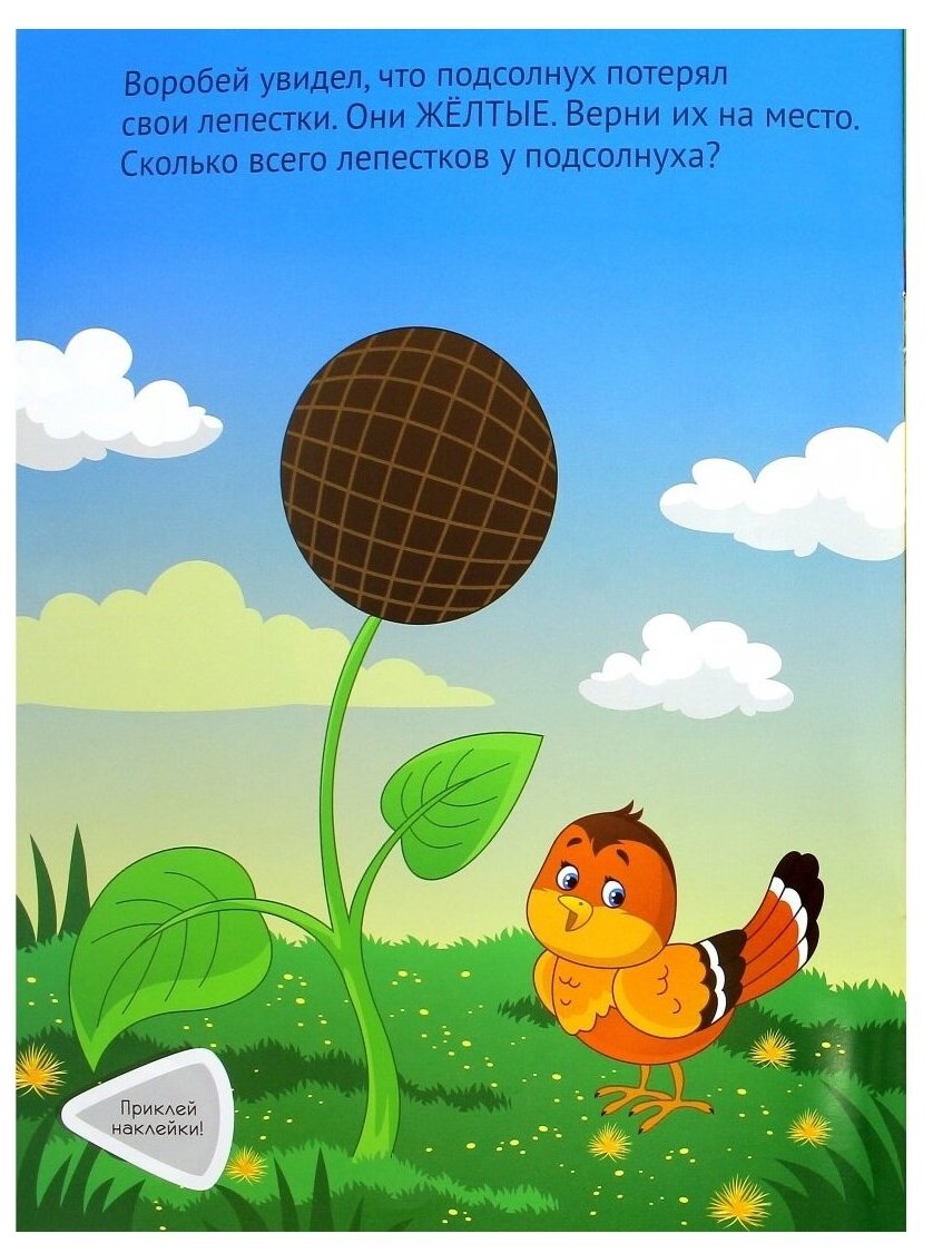 Приклеивая наклейки ребенок не только развивает мелкую моторику, но и в игровой форме знакомится с окружающим миром (курочка высиживает яйца, сенью листочки на деревьях желтеют и они опадают), учится сравнивать (большой. маленький), считать (сосчитай листочки, сколько звезд на небе, сколько лепестков у подсолнуха).