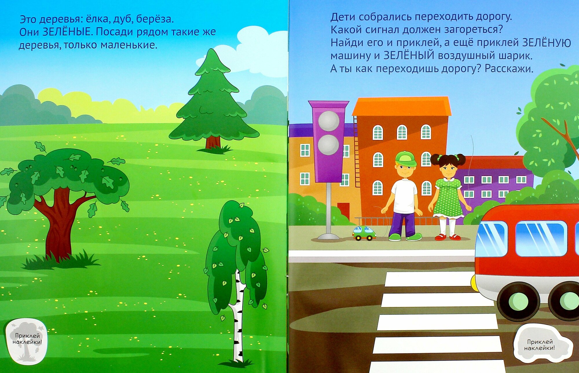 Задания неплохие. Ребенок 2-х лет справился быстро, ему понравилось. Но при выполнении некоторых из заданий возникли нестыковки с наклейками. Если приклеивать большую машину, то она займет весь пешеходный переход, а как дети перейдут на зеленый цвет? Мы не стали приклеивать туда автомобиль. Непонятно, каким образом разместить пять яблок в корзине, а в другой огурцы. Мы наклеили по одному. Образцы страниц с результатами наших усилий приведены ниже.