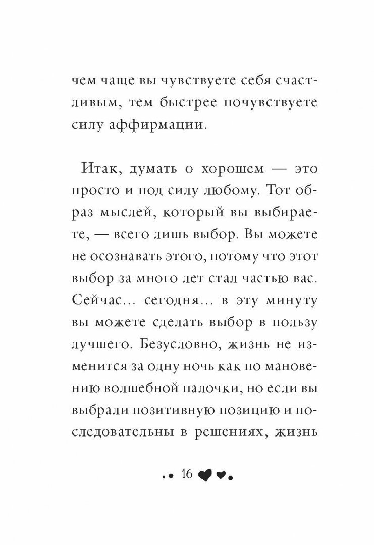 С этой книжки начались благотворные изменения в моей жизни. Раньше я приобретала книги по самопомощи, но лишь читала их, активно не применяя упражнения и рекомендации, приведенные в них. Теперь же... Если честно, больше воспринимала это всё как утешительные книги, для успокоения и хорошего настроения, не более. Мне не очень... Да ладно! вообще не верилось, что втирая себе "я открываюсь вселенскому изобилию!", "я достойна и я любима!", "я замечательный человек!" итд. можно в реале улучшить свою ситуацию. Самоутешение - это хорошо, это здорово, это нужно для самолюбия и душевного равновесия, но для действительного положения дел?...как слова и фразы тут помогут? Но читать истории самой Луизы Хей и ее последователей все же было интересно. И в общем, в один из серых и тоскливых дней решила, "а почему не попробовать? что теряю?". Аффирмации, мантры, медитации - оказалось, то довольно прикольно)) Приходилось делать усилия, заставляя себя верить в то, что произносилось, во что не верилось)) Раз за разом, день за днем, утверждая позитивные вещи о себе, о своей жизни, о Вселенной, настаивая на этом, твердя, прочувствуя (!!!) смысл своих слов, отмечаешь, как в самом деле происходят некие изменения. Сначала выравнивается настроение, уходит пессимизм и мрачное состояние духа; а потом неожиданные перемены на внешнем плане. Такое чувство, позитивные аффирмации и практики - явление двусторонней направленности: воздействие на состояние и самочувствие практикующего и одновременно посыл во внешний мир, в разумную чуткую Вселенную. И отклик так позитивен и благоприятен как и те слова и намерения, что стоят за ними. советую всем приобретать и пользоваться книгами Луизы Хей, в частности эту самую.