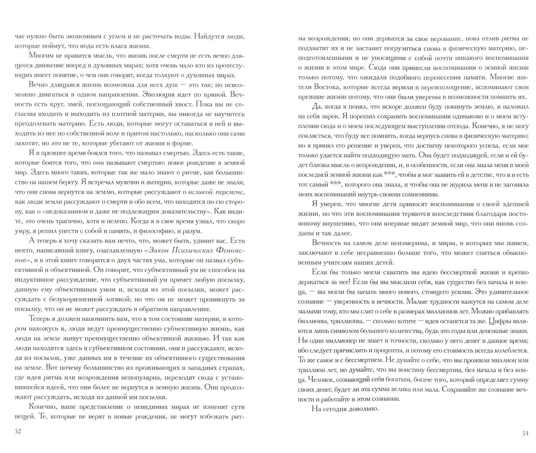 Очень мелкий шрифт. Очень неудобно читать. Даже мне, как человеку никогда не жалующему на зрение и на размер шрифта. Что касается самой сути изложенных писем. Поначалу очень сложно втянуться в чтение, потому как мысль излагается несколько непривычно и приходилось перечитывать несколько раз, чтобы понять о чем речь, но потом подстраиваешься и уже читается вроде легко и свободно. Очень интересно и перекликается с книгой Инны Волошиной "За порогом жизни". Авторы с разных стран, но пишут об одном и том же, только несколько с разным оттенком.