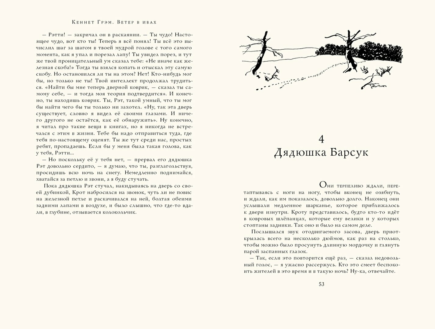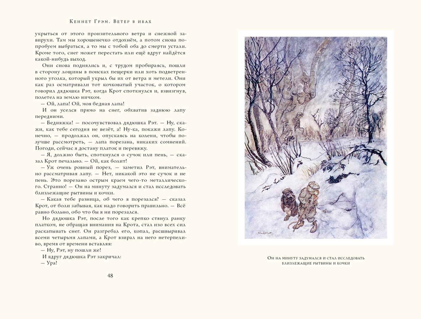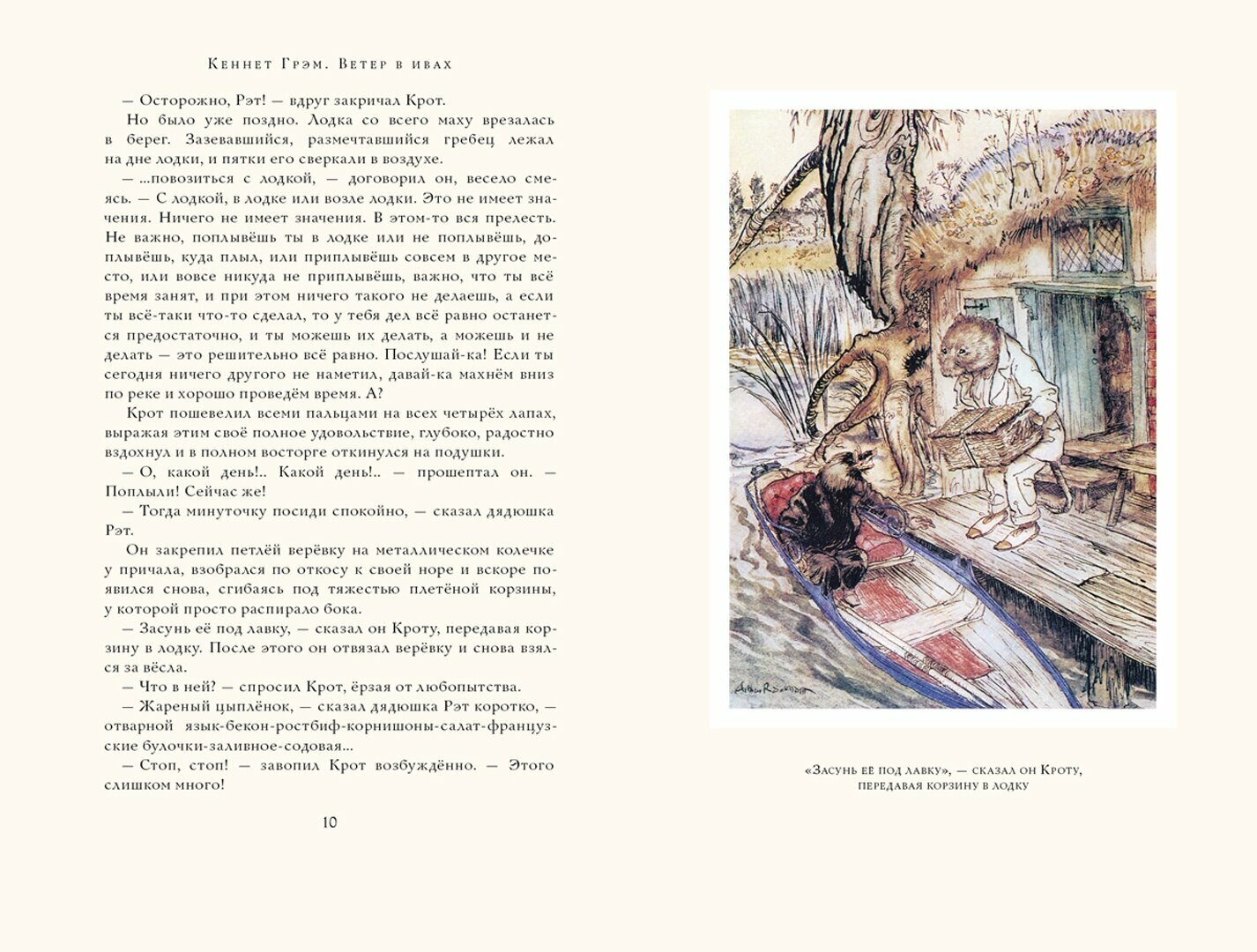 Далеко не все знают, что эта книга начиналась как серия писем автора единственному сыну Алистеру - в семье у него было шутливое прозвище Мышь. Возможно, именно так и появился один из главных героев - дядюшка Рэт. Мудрая и поэтичная сказка быстро стала популярной. Со временем её неоднократно экранизировали и ставили спектакли (в самой первой постановке принимал участие Алан Милн). А проиллюстрировал приключения четырёх верных друзей Артур Рэкхем.