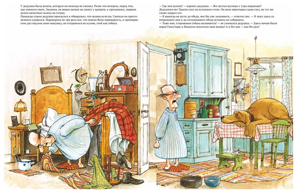 История проста. Однажды утром дедушка (который, кстати, будет постарше Петсона) проснулся и не обнаружил своей любимой шляпы. В процессе поисков, которые и составляют практически всю историю, он находит неизвестно откуда взявшихся солдатика, цепочку, перочинный ножик, магнит и свисток. Вылетев из мотоцикла и оказавшись в тишине и одиночестве, дедушка вдруг вспоминает очень давнюю историю. "И вот он сидит тут – маленький старичок на огромном лугу – и думает о той далекой поре, когда ему было всего семь лет и он жил с бабушкой, мамой и папой да еще с пятью братьями и сестрами, и том, как у него появился ёжик. Дедушку и раньше посещали воспоминания о тех временах, но теперь ему удалось вспомнить гораздо больше. И все это благодаря тому, что от него сбежала его старая шляпа."