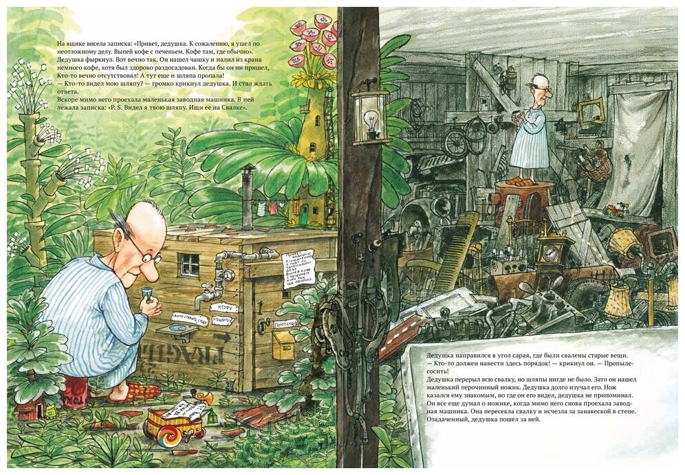 Очень милая и светлая история про дедушку, от которого улетела его шляпа. И в поисках шляпы он вдруг находит счастливый момент своего детства, вспоминает свои "сокровища" и мечты, своих родных.