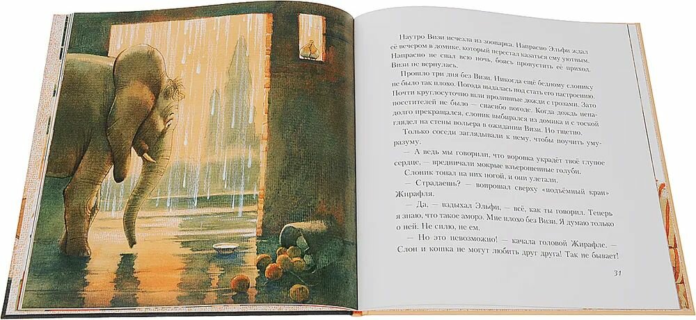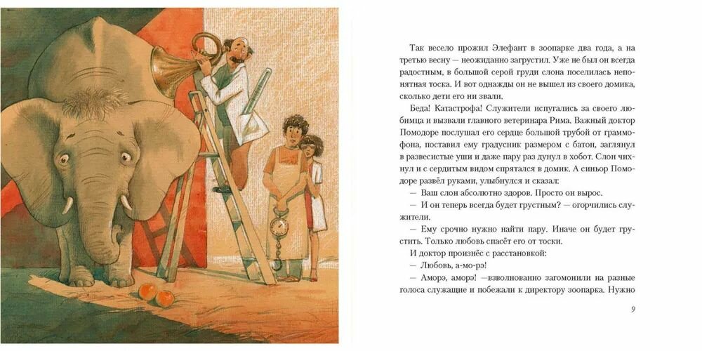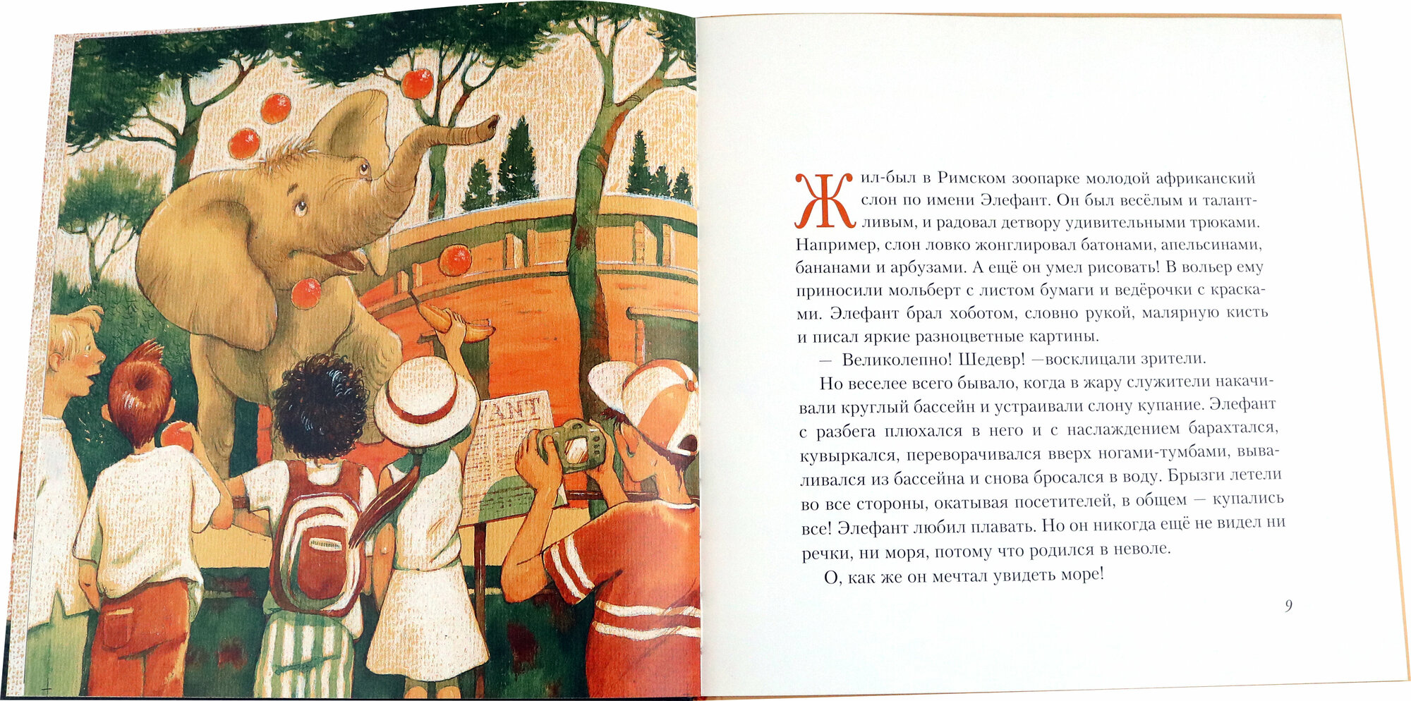 В римском зоопарке жил слоник Элефант, он был очень весёлый. Но однажды в его большой серой груди поселилась тоска. Самый главный ветеринар Рима поставил диагноз Аморэ. И слон начал мечтать о невесте, такой же большой и серой.. И тут случилось необъяснимое, он подружился с рыжей кошкой. Кошки, конечно, мудры, но в то же время чуточку коварны. Благодаря этой рыжей красавице, слон Элефант решился на опасное путешествие, обрёл свободу, узнал, как проходит жизнь за стенами римского зоопарка. За авантюрным началом следует романтичный и счастливый конец истории. В этой книге очень много иллюстраций, и они выше всяких похвал. И, кстати, по ним можно изучать итальянский язык:-)