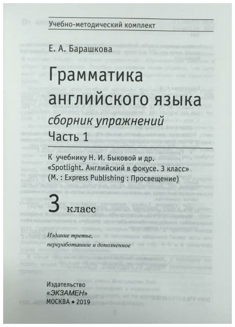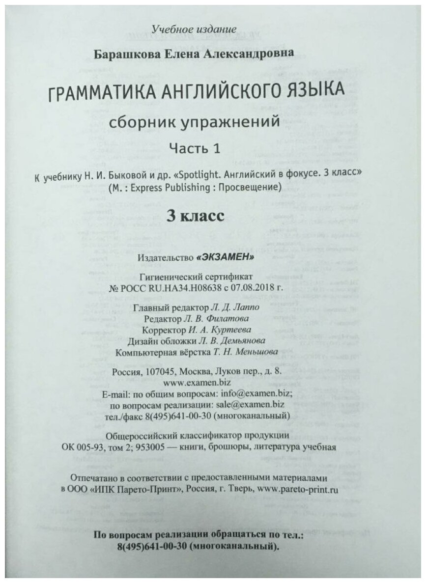 Английский язык. 3 класс. Грамматика. Сборник упражнений к учебнику Н. Быковой и др. Часть 1. (Барашкова Елена Александровна); Экзамен, 2024