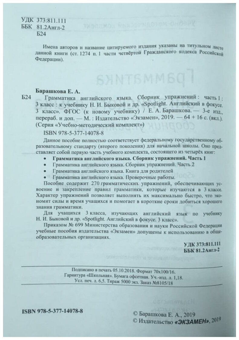Сборник состоит из 2 частей. Первая часть где-то до 7 unit по учебнику Spotlight 3 класс. Хорошее пособие для отработки грамматики. Занимаюсь с сыном сама по ним. Помогает книга для родителей, где вся грамматика подробно рассказана.