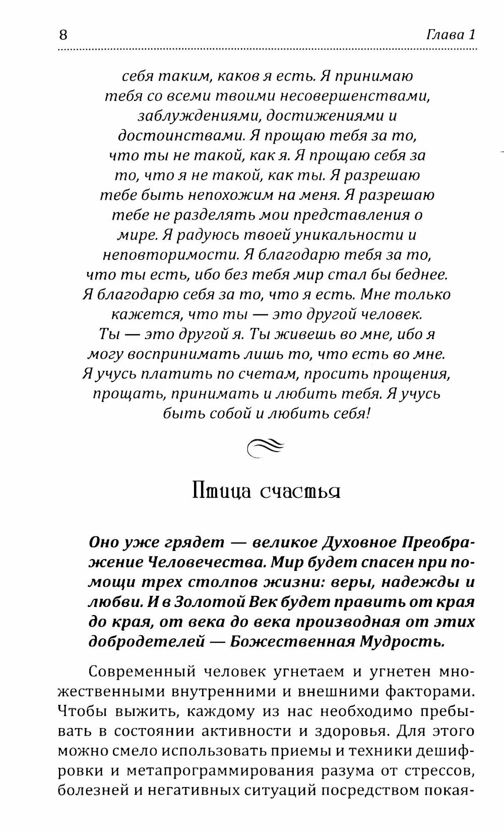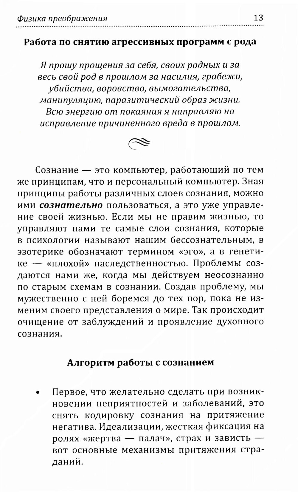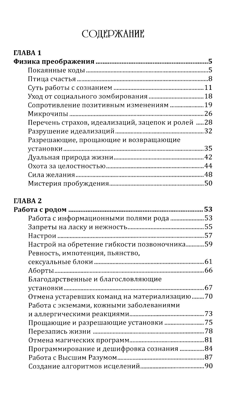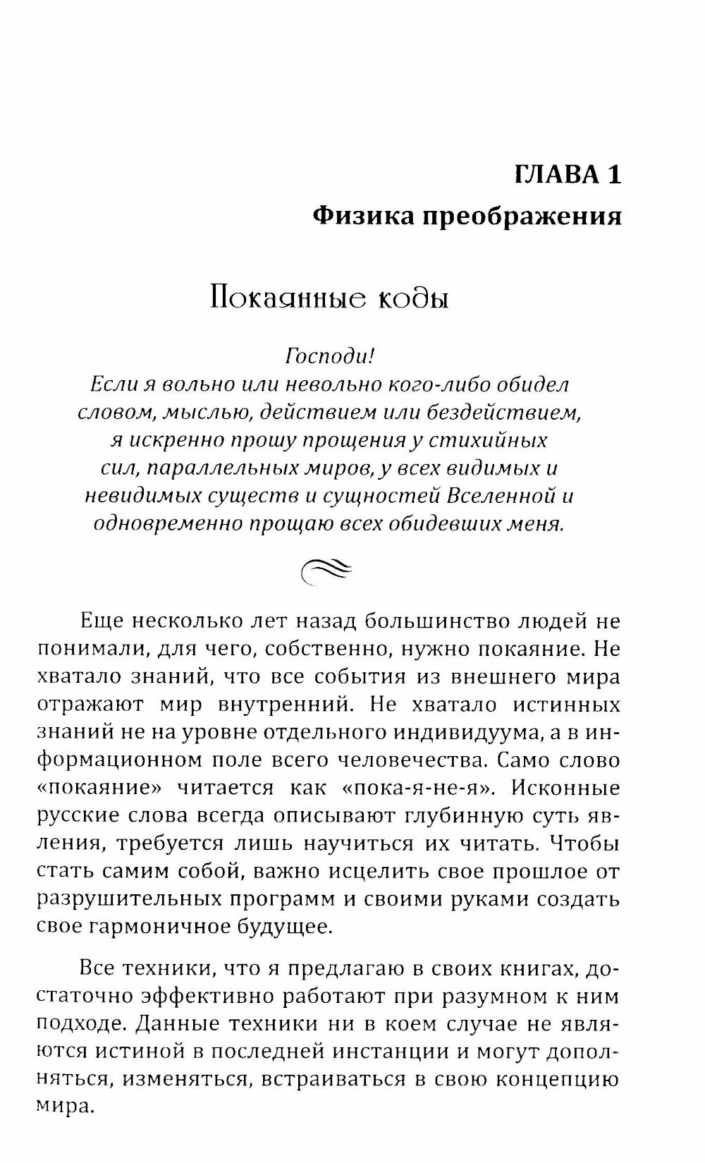 В этой книге предложены новые подходы к практикам покаяния, молитвам, настроям, аффирмациям, техникам по исцелению души и тела, преображению разума и окружающего пространства. Основная идея заключена в создании действенных инструментов по работе с сознанием. Такими инструментами могут быть специально подобранные словесные коды, способные исцелять многие заболевания и лечить негативные ситуации. Информация спрессована в коротких, но емких формулах. Для людей новой эпохи важно иметь под рукой конкретные - на разные случаи жизни - покаянные и молитвенные коды, способные эффективно противодействовать нарастающему давлению внешней и внутренней среды. Нет смысла создавать велосипед; в остроте ситуации проще пользоваться уже готовыми формулами.