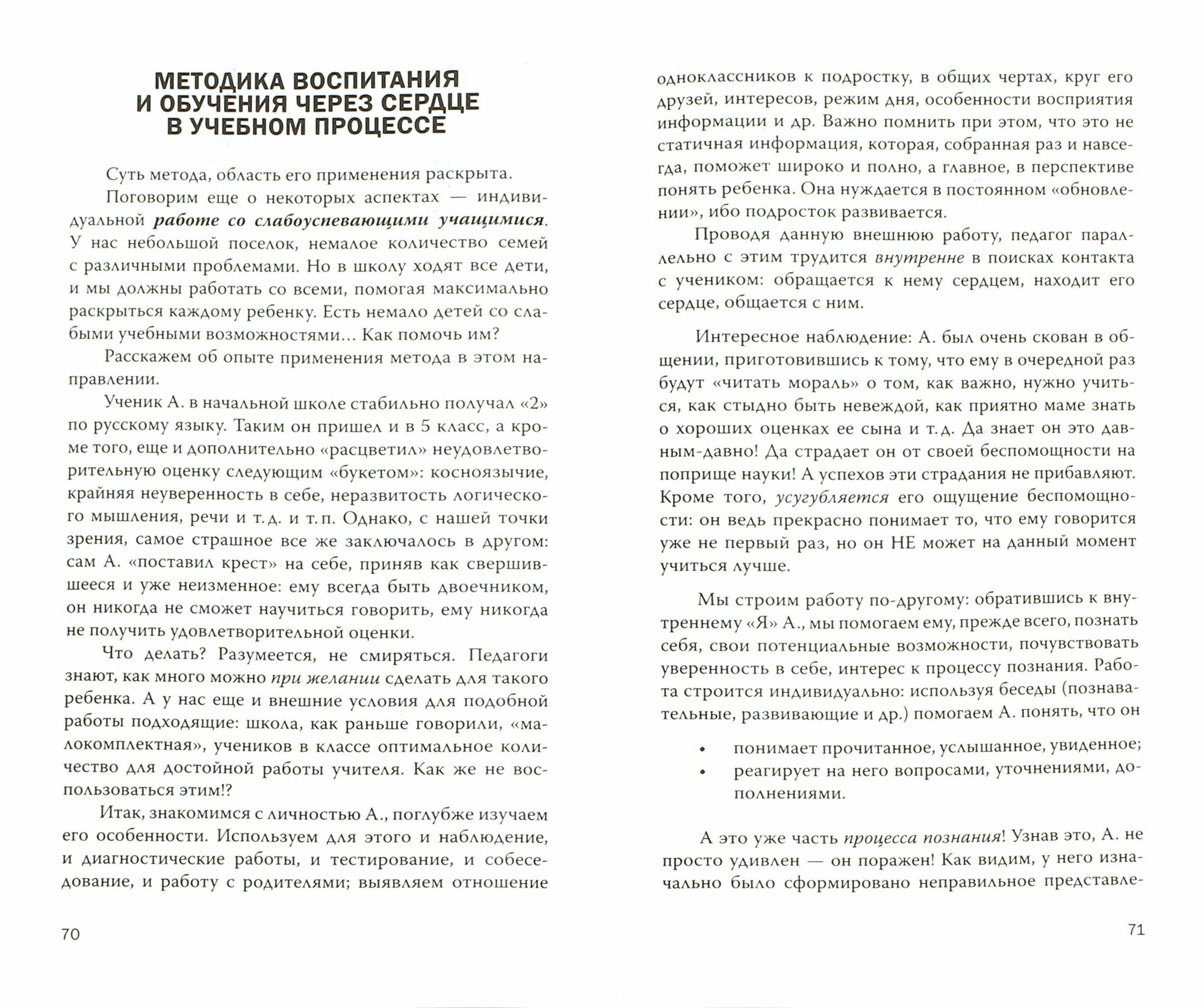 В книге раскрывается методика преподавания в школе через сердце, т.е. как вести уроки с позиции гуманизма и прививать детям человеколюбие, мораль, понятие о настоящей красоте и основополагающим жизненным принципам . В процессе чтения чувствуется любовь авторов к своей методике. Также данная методика отводит особое место работе с родителями и объясняет, как правильно выстроить такую работу. В книге есть ссылки на восточные верования и восточную философию.