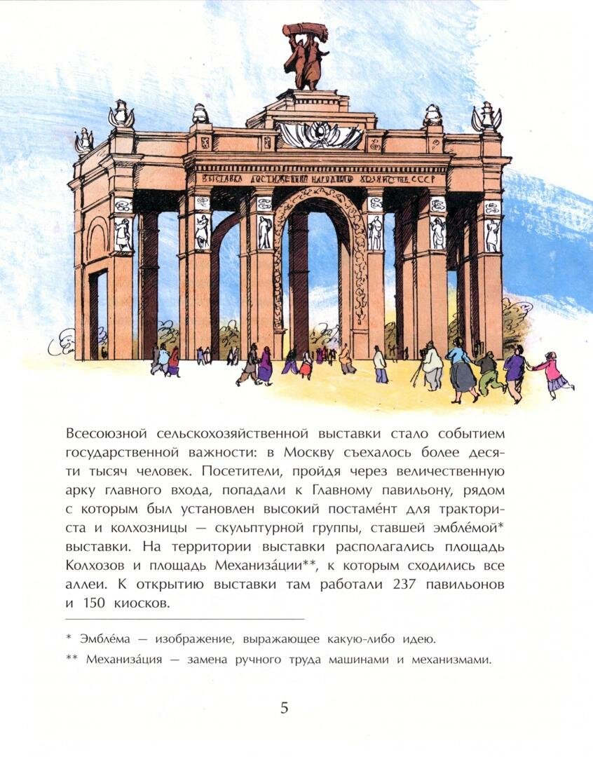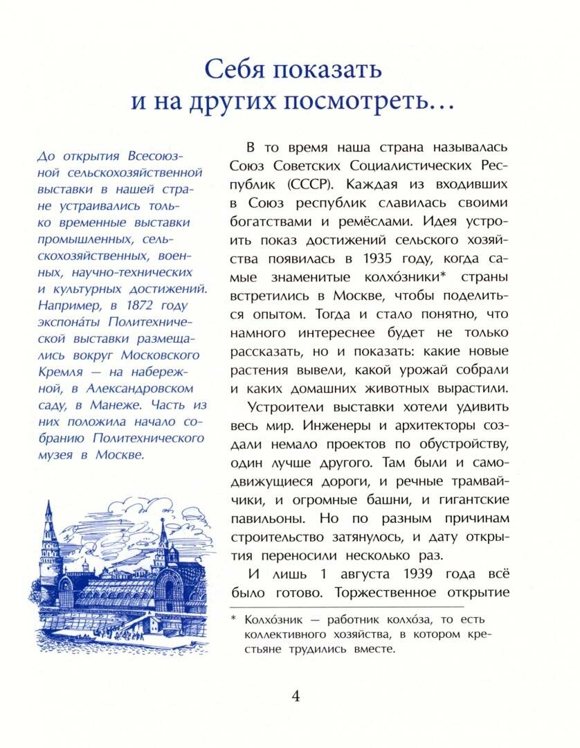 Всегда с большим интересом ждем новинки из серии "Настя и Никита". И вот наконец-то новый выпуск - уже 147! Издатели продолжают радовать нас книжками об исторических местах. На этот раз их выбор пал на главную выставку страны - ВДНХ. Книга примечательна уже с форзаца: с одной стороны на нем изображена схема размещения павильонов, а с другой стороны - расположение главных фонтанов и скульптур. В самой брошюре довольно подробно описывается история появления ВДНХ, создания некоторых особо известных павильонов, фонтанов и главной скульптуры "Рабочий и колхозница" - символа ВДНХ. Авторы знакомят юных читателей с любопытными фактами из истории Выставки. Оказывается, раньше на территории ВДНХ стоял маяк, возле которого все желающие могли совершить погружение в воду в водолазном костюме. А еще работал целый сахарный завод в миниатюре и даже атомный реактор! И олимпийский Мишка, исполнявший "Калинку" в павильоне "Юные натуралисты", и макет орбитальной станции "Салют", и "Круговая панорама", и рай для рыболовов на выставочных прудах... Сколько же всего таила в себе главная выставка нашей страны. И сколько еще предстоит ей предложить нашему вниманию.