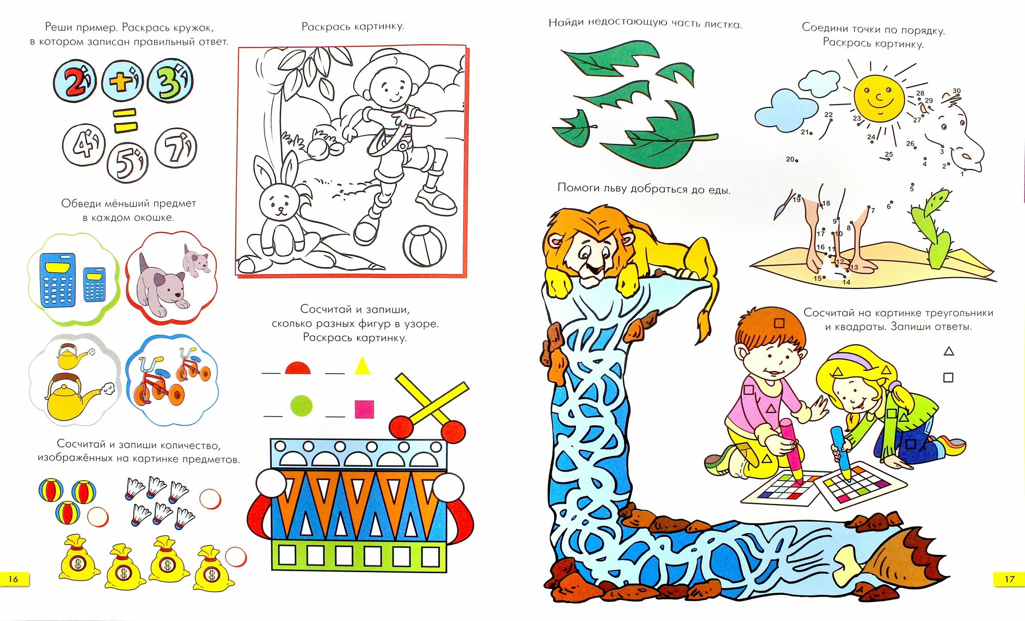 Тетрадь с очень интересными и разнообразными заданиями различной степени сложности: лабиринты, обведи по контуру, раскрась по цветам, найди лишнее, различные задачи с решением примеров, найди одинаковые картинки, сравнения и т.д.