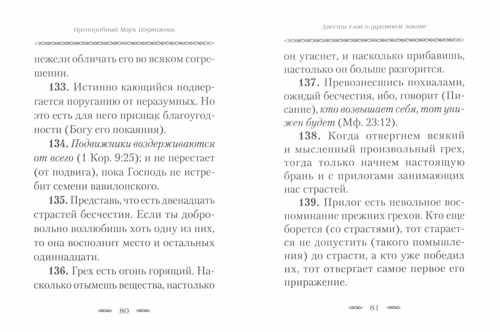 Маленькая книжечка, состоящая из двух частей : сочинений преп. Симеона Нового Богослова ( 42 стр. ) и приложения преп. Марка Подвижника " Двести глав о духовном законе ". Первая часть рассказывает вкратце историю юноши, который смог подняться к вершине святости и удостоился узреть Самого Господа, благодаря тому, что на его жизненном пути встртился мудрый и опытный наставник. Вторая часть - это именно то произведение, которое советовал читать наставник. Оно состоит из пунктов, в которых содержатся размышления преп. Марка Подвижника. Конечно, православному человеку всё это будет понятнее. Однако, и непосвященному читателю, живущему в православной среде, может быть интересно. Например, пункт 29 : " Щедрому сердцу явлено, что оно ущедрено будет, и милостивому - что оно подобным же образом встретит милость
