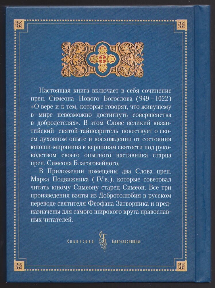 Настоящая книга включает в себя сочинение преп. Симеона Нового Богослова (949-1022) "О вере и к тем, которые говорят, что живущему в мире невозможно достигнуть совершенства в добродетелях". В этом Слове великий византийский святой-тайнозритель повествует о своем духовном опыте и восхождении от состояния юноши-мирянина к вершинам святости под руководством своего опытного наставника старца преп. Симеона Благоговейного. В Приложении помещены два Слова преп. Марка Подвижника (IV в.), которые советовал читать юному Симеону старец Симеон. Все три произведения взяты из Добротолюбия в русском переводе свт. Феофана Затворника, публикуются в современной редакции и предназначены для самого широкого круга православных читателей.