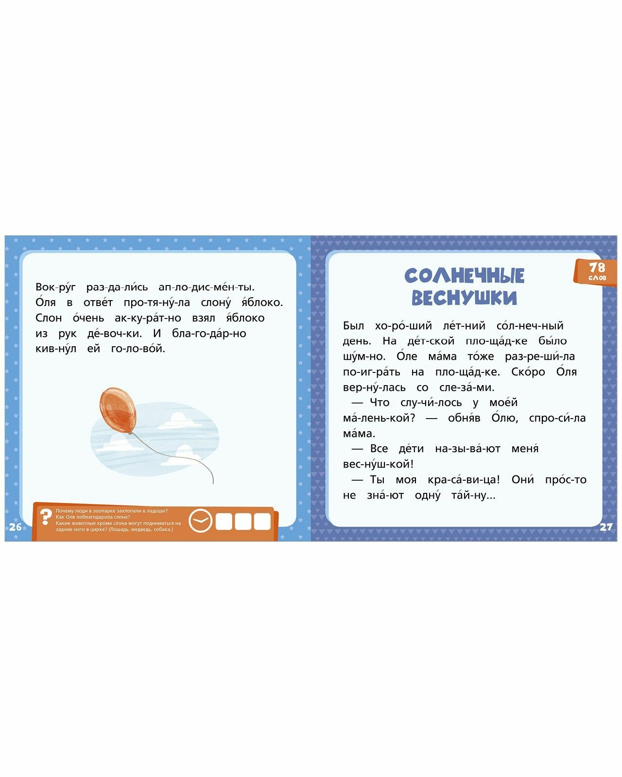 много иллюстраций,небольшие рассказы в которых слова поделенны на слоги и стоят ударения, шрифт крупный.