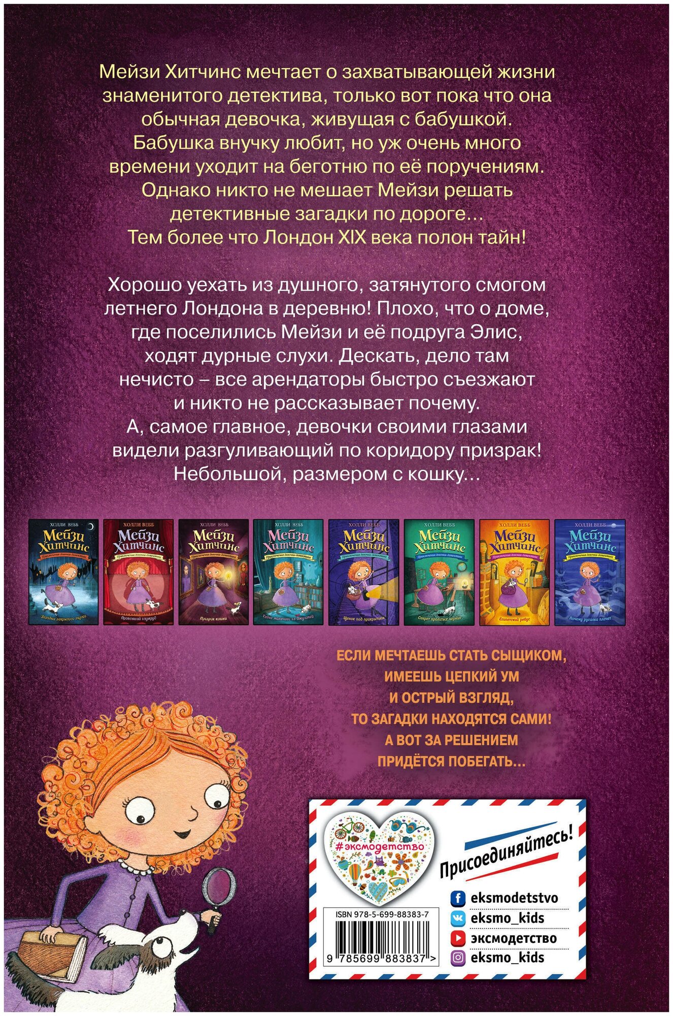 Серия книг Холли Вебб про девочку-детектива Мейзи Хитчинс уже несколько лет входит в топы продаж. Это образцовый детектив для детей — тайны, которые расследует девочка, под силу разгадать ребёнку! Здесь полно приключений, трогательных и смешных моментов и удивительных фактов из истории викторианского Лондона!