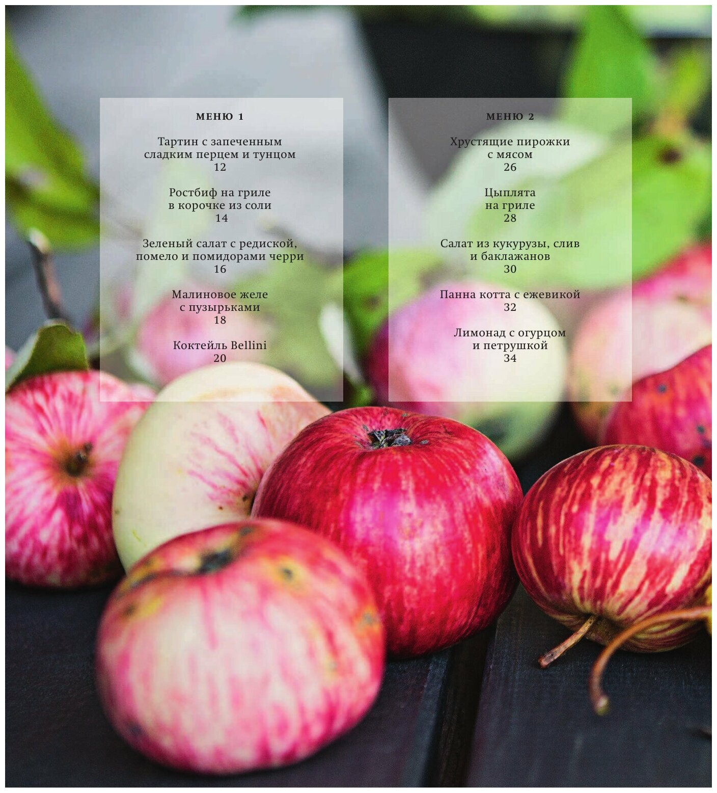 Книга с оригинальной концепцией и изысканными рецептами. С одной стороны просто – с другой очень утонченно и по-летнему легко и ярко. Есть рецепты и закусок, и горячих блюд, включая всеми любимые шашлыки, десерты, а также коктейли и напитки. В общем – полноценная трапеза со всеми составляющими. Очень порадовала концепция не отдельных рецептов, а полного меню. Для меня это оказалось очень удобным, не надо ломать голову и лезть в тысячи разных книг, чтобы составить один полноценный обед. Приятно, что автор такое придумал. Книга на твердую пятерку.