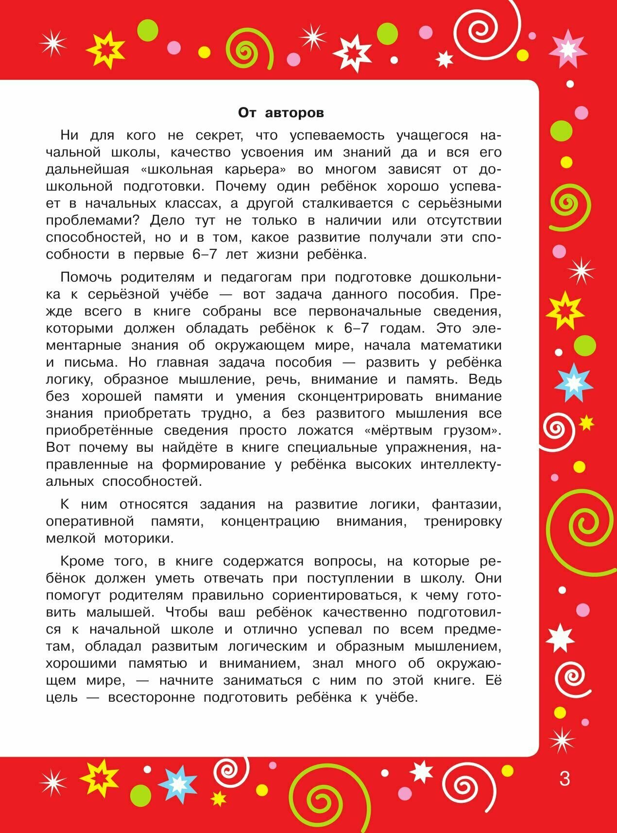 В пособии известных педагогов-практиков собраны и детально рассмотрены все важнейшие темы для подготовки ребенка к школе. К каждой теме подобраны упражнения и задания, а также более 100 тестовых заданий для проверки полученных знаний.