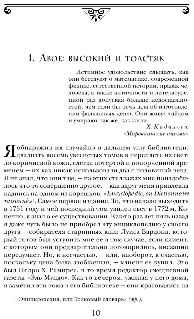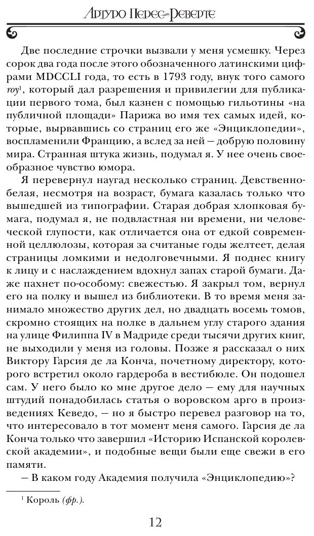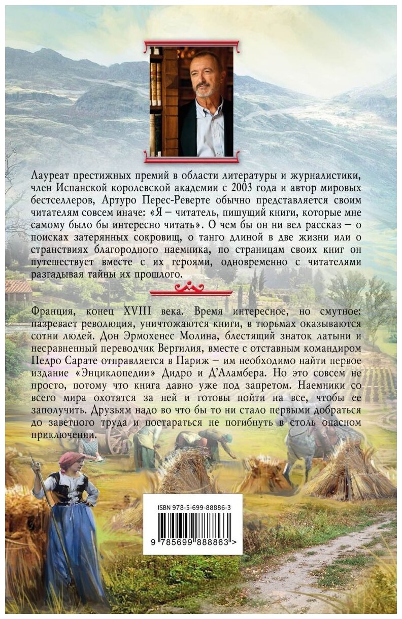 Франция, конец XVIII века. Время интересное, но смутное: назревает революция, уничтожаются книги, в тюрьмах оказываются сотни людей. Дон Эрмохенес Молина, блестящий знаток латыни и несравненный переводчик Вергилия, вместе с отставным командиром Педро Сарате отправляется в Париж – им необходимо найти первое издание "Энциклопедии" Дидро и Д’Аламбера. Но это совсем непросто, потому что книга давно уже под запретом. Наемники со всего мира охотятся за ней и готовы пойти на все, чтобы ее заполучить. Друзьям надо во что бы то ни стало первыми добраться до заветного труда и постараться не погибнуть в столь опасном приключении.