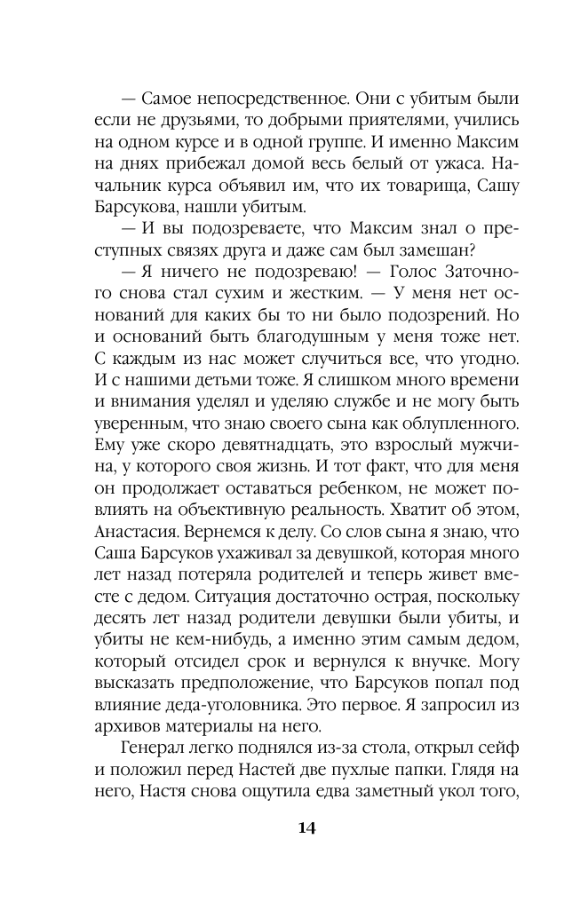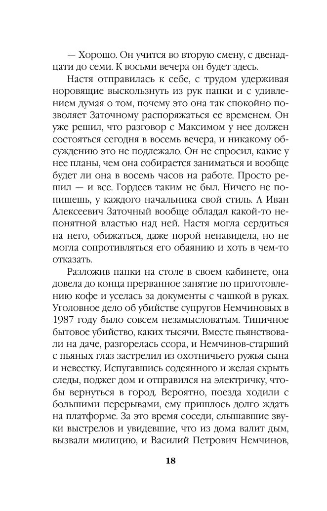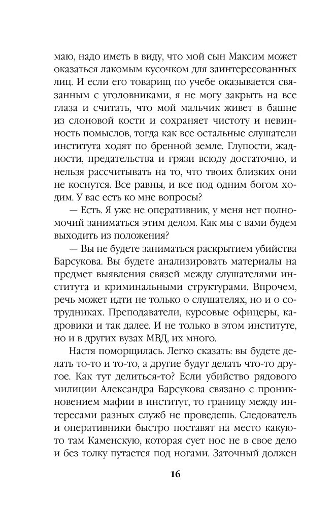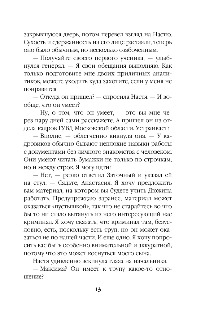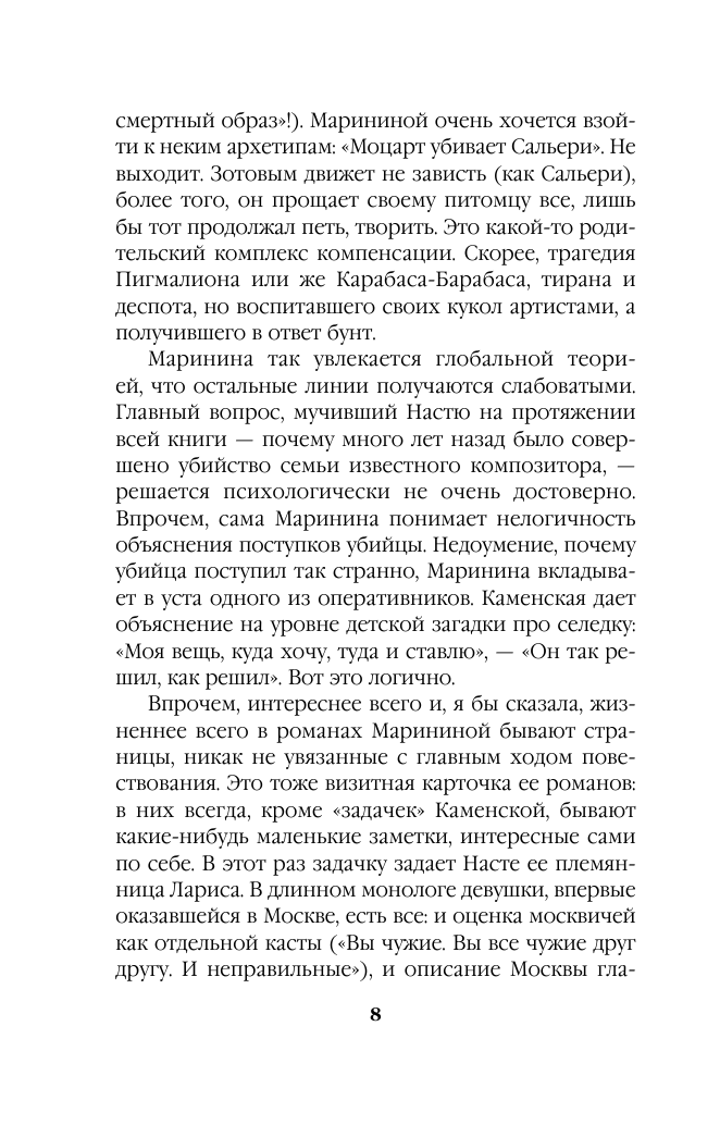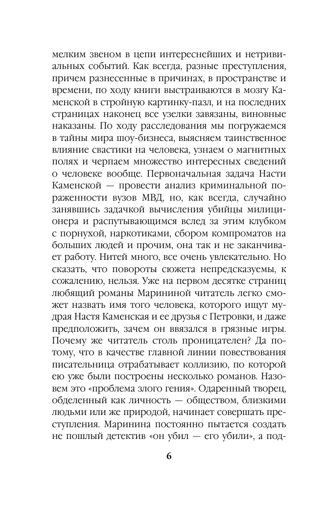 Александра Маринина пишет довольно таки сложные и интригующие детективы, с крепкой сюжетной линией, хитросплетениями, рассуждениями, умозаключениями и своей позицией на жизнь и время. Все это она передает через свою главную героиню Анастасию Каменскую.