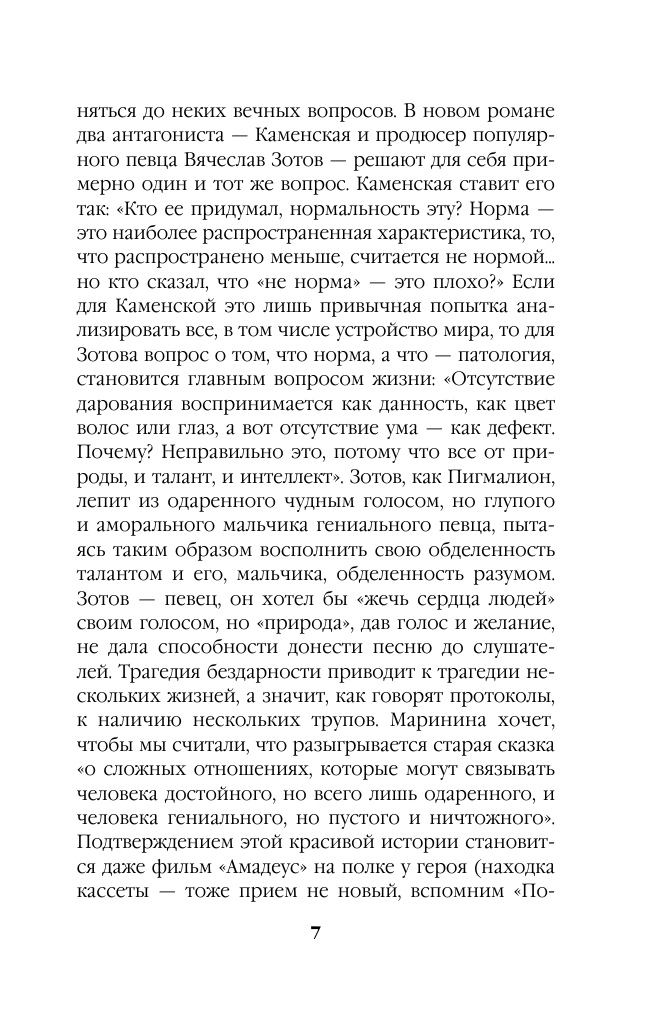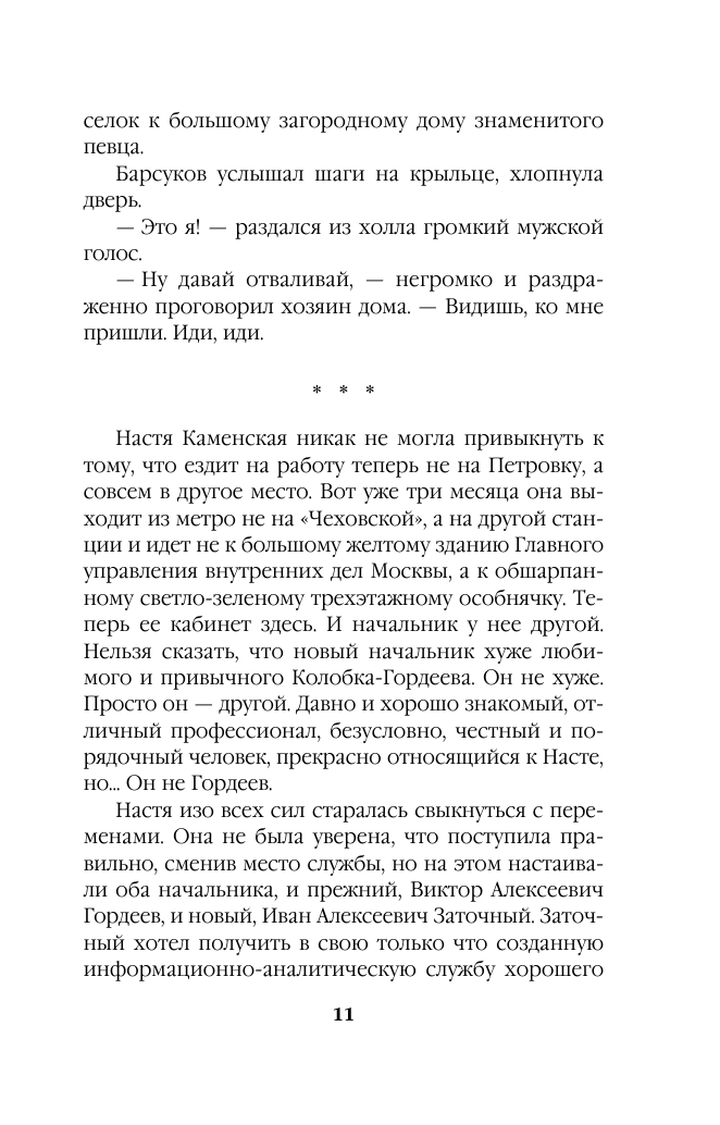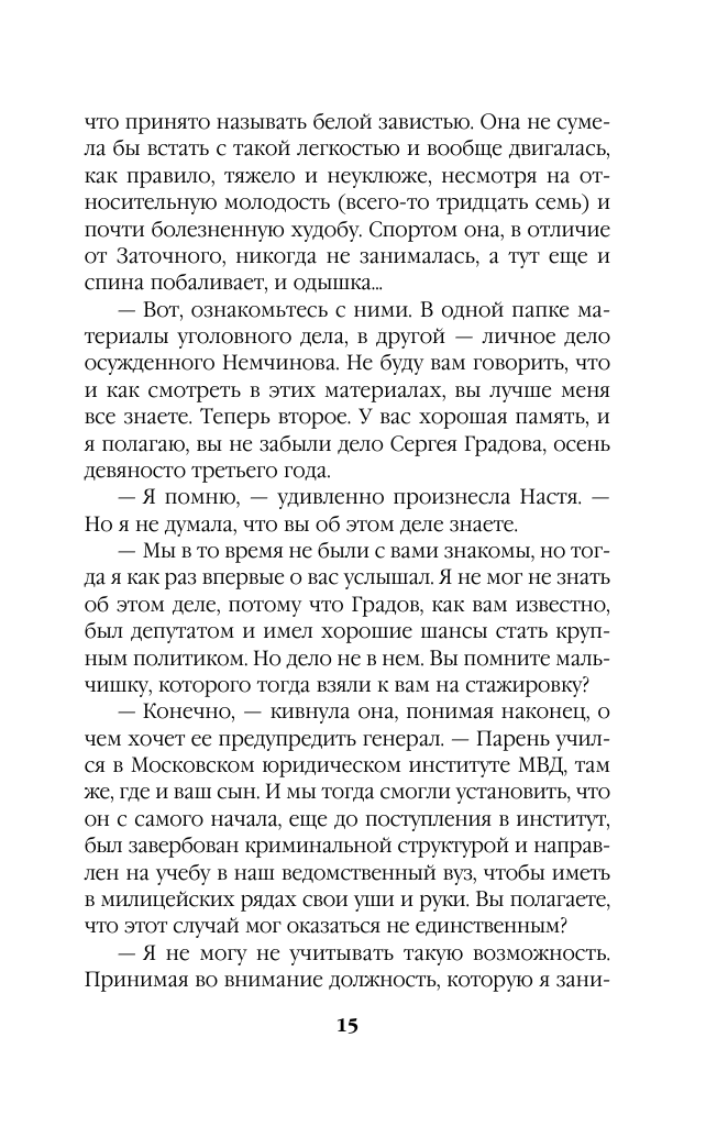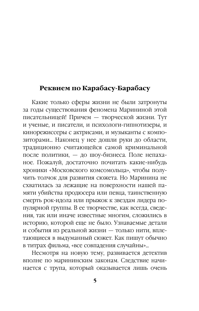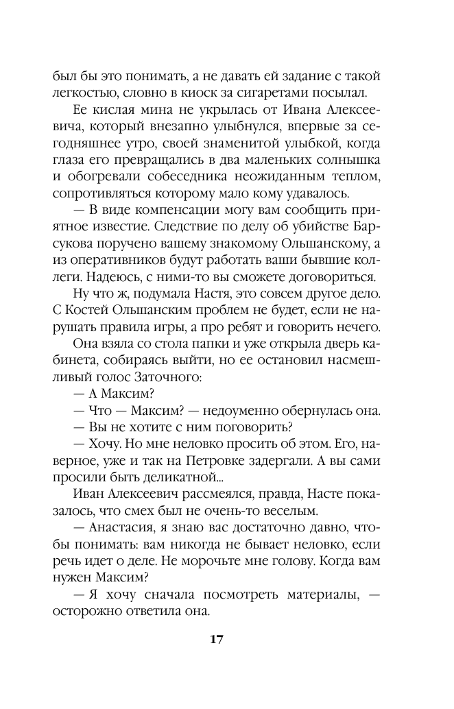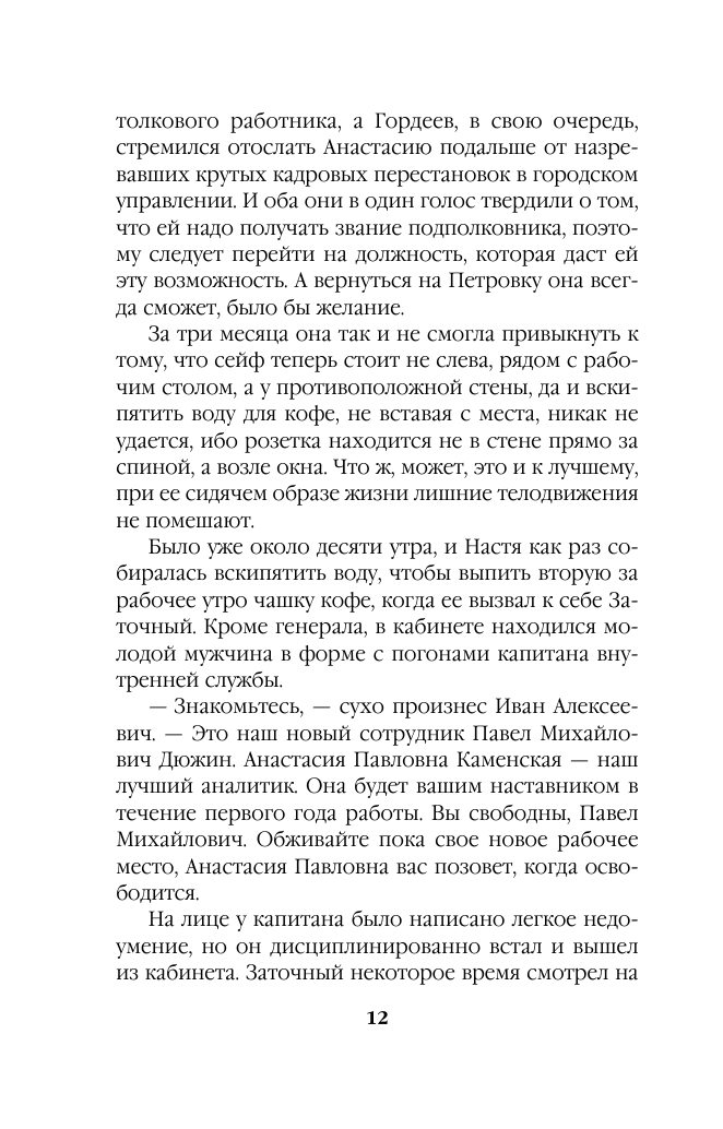 Александра Маринина пишет довольно таки сложные и интригующие детективы, с крепкой сюжетной линией, хитросплетениями, рассуждениями, умозаключениями и своей позицией на жизнь и время. Все это она передает через свою главную героиню Анастасию Каменскую.