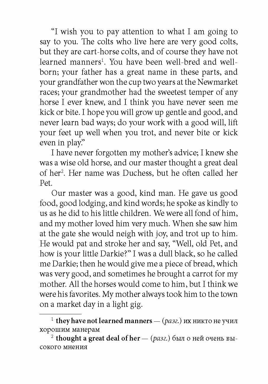 Я бы обязательно посоветовала прочитать ее детям, будь то в русском варианте или английском, так как действительно видишь и понимаешь, как не нужно поступать с животными. Повествование ведется от лица лошади, что придает больше реалистичности.