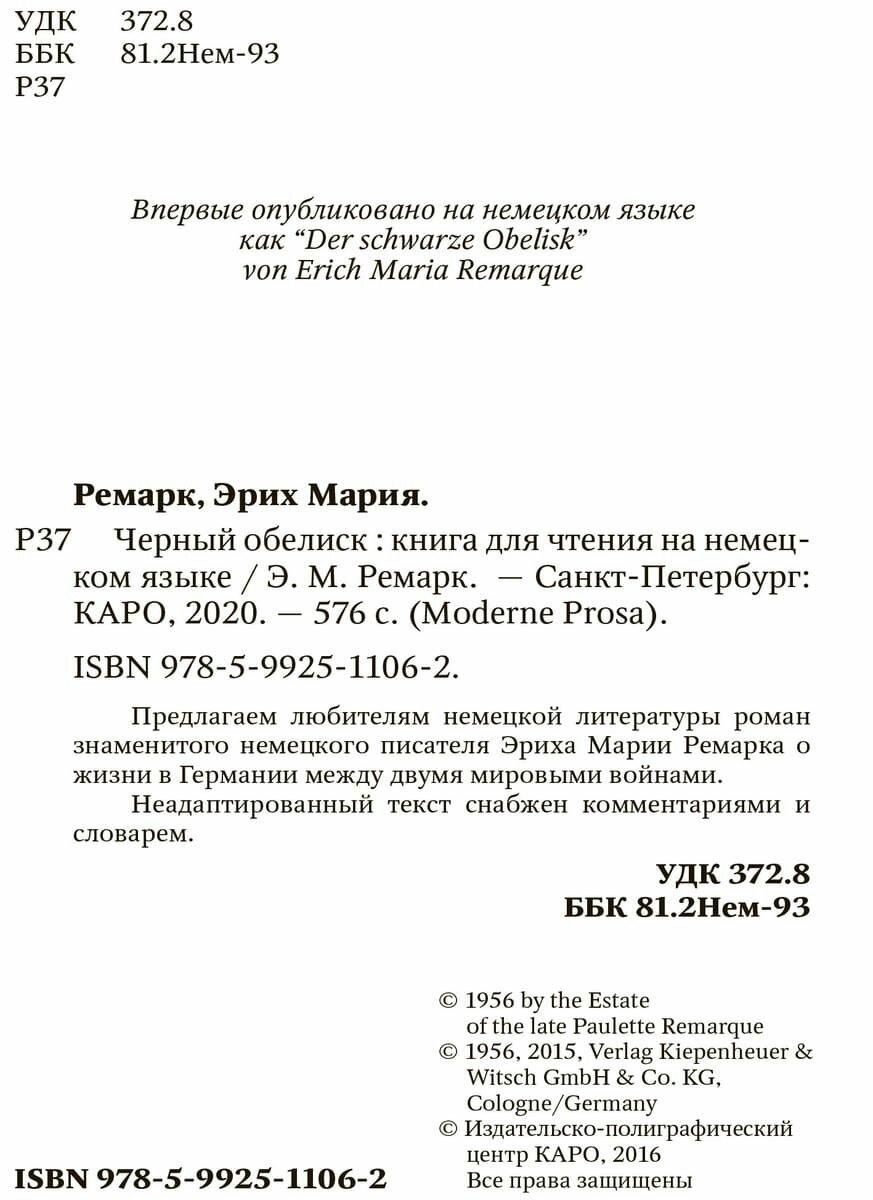 Вот и осилил еще одну книгу на немецком языке. «Der schwarze Obelisk». Комментариев по тексту немного, и поэтому я довольно часто обращался к словарю.