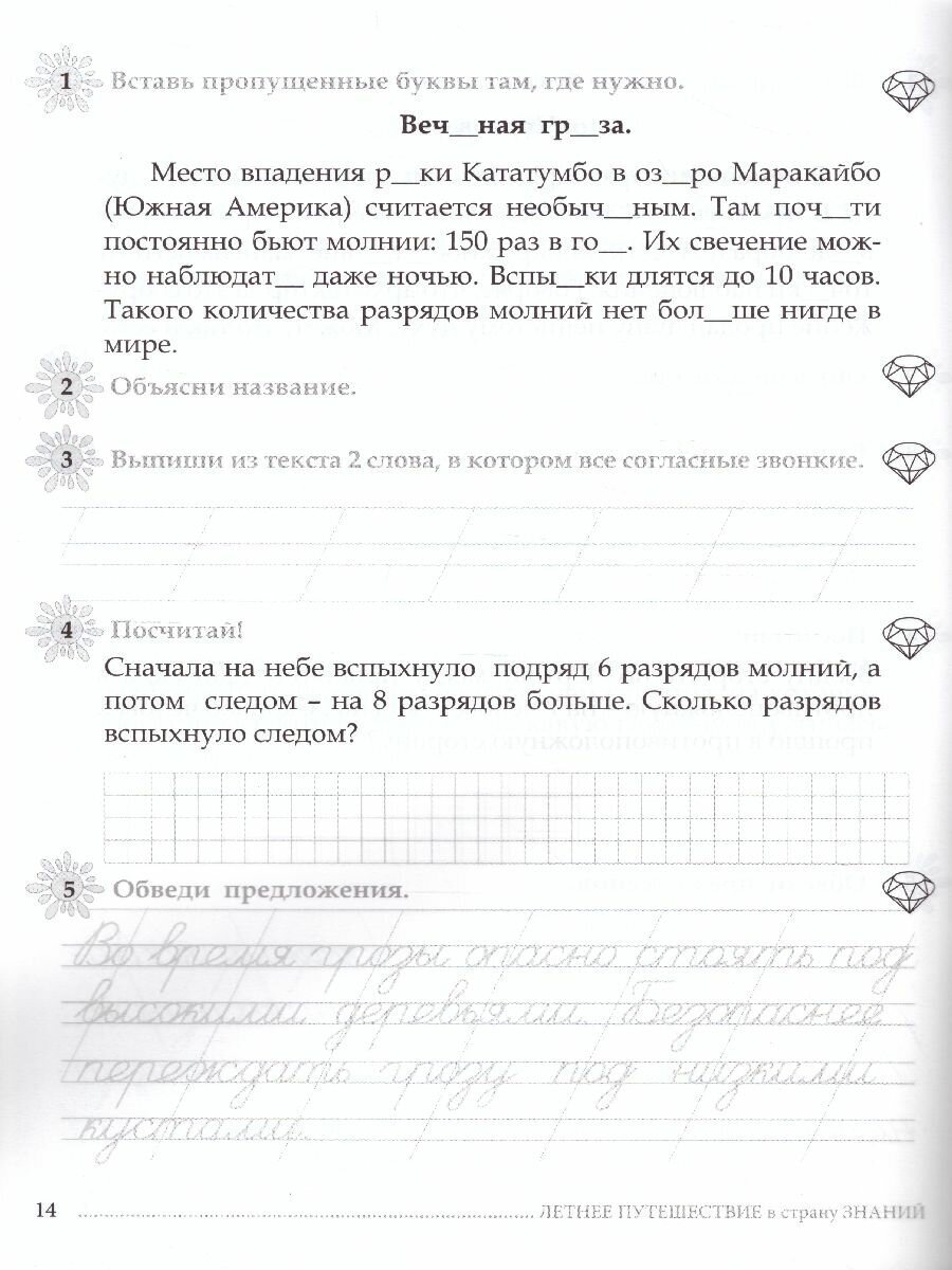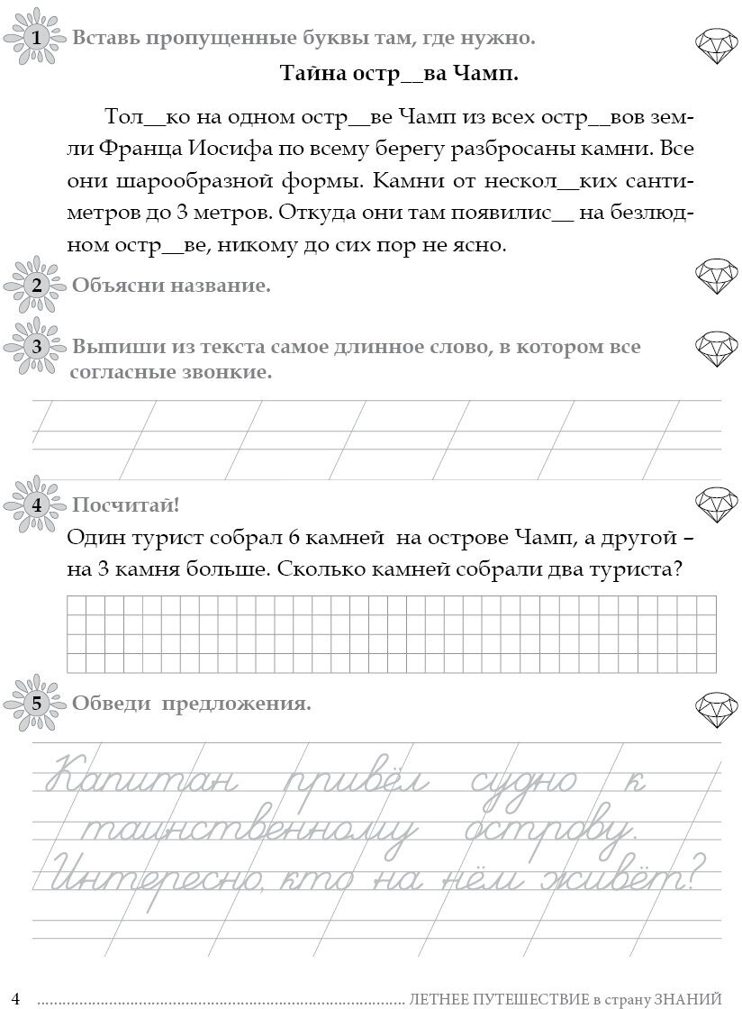 Удачное сочетание заданий по основным предметам.Подобраны интересные познавательные тексты, есть задания по каллиграфии. Присутствует игровой момент: выполняя задание, ребёнок "путешествует" из страны в страну. Эта книга понравилась больше чем "Комбинированные летние задания "Л.Я. Иляшенко, И.В.Щегловой