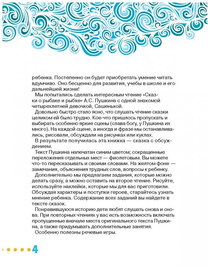 Чтение сказок детям - давняя замечательная традиция в наших семьях. Сказки полезно не только читать, но и обсуждать с ребенком. Их можно пересказывать своими словами, разыгрывать сцены, объяснять характеры героев. Опыт такого разнообразного "общения" с одной из самых любимых сказок А.С. Пушкина, "Сказкой о рыбаке и рыбке", вы найдете в этой книге. Вам встретятся замечания, объяснения трудных слов, вопросы и задания для вашего ребенка. В книге можно рисовать и использовать специальные наклейки, которые вы тоже найдете внутри.