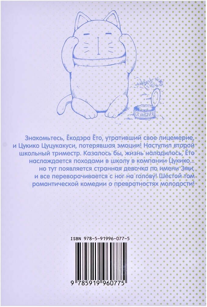 Знакомьтесь, Ёкодэра Ёто, утративший своё лицемерие, и Цукико Цуцукакуси, потерявшая эмоции! Наступил второй школьный триместр. Казалось бы, жизнь наладилась, Ёто наслаждается походами в школу в компании Цукико... но тут появляется странная девочка по имени Эми, и все переворачивается с ног на голову! Шестой том романтической комедии о превратностях молодости!