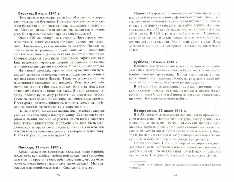 Дневники неполные. Вскользь упоминаются схемы боев, но в книге ничего такого нет. Только текст. Редактура неряшливая – главы книги или их содержание несколько раз обрывается или продолжается непоследовательно. Тем не менее, кое-какие интересные детали боев летом, зимой 41-го. Наглядно показано превосходство тактики, подготовки, действий немцев над нашими.