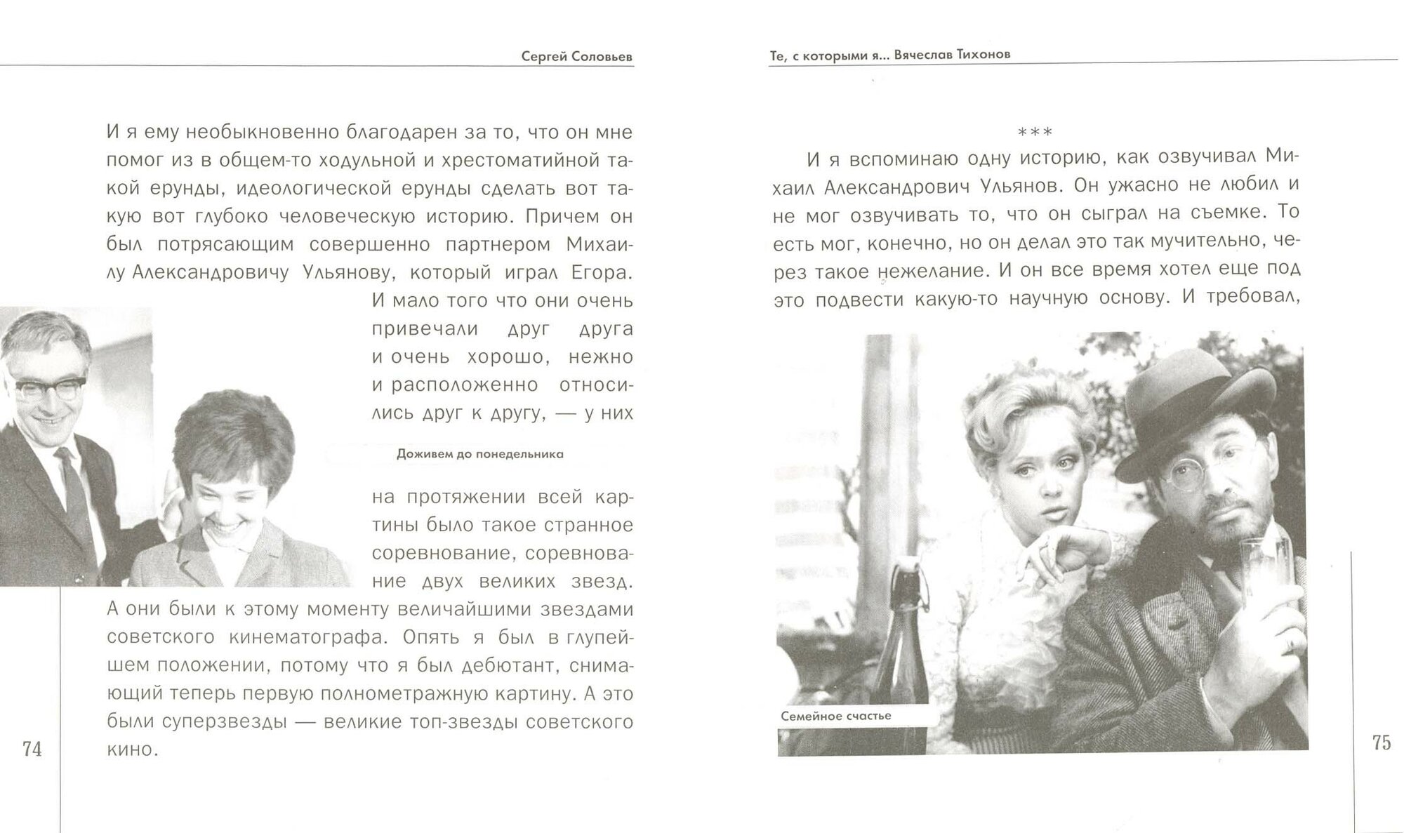 Имя Вячеслава Васильевича Тихонова - великого советского и российского актера - навсегда вписано в историю отечественного кино. Вдвойне счастливы те, кому посчастливилось общаться с легендарным актером лично. Книга известного кинорежиссера Сергея Александровича Соловьева, созданная по мотивам его фильма о Вячеславе Тихонове из цикла "Те, с которыми я..." для телеканала "Культура", пронизана трепетным отношением к выдающимся современникам, с которыми автора сводила судьба на съемочной площадке и за ее пределами. Его словесные портреты выдающихся мастеров экрана лишены банальных черт, общеизвестных фактов, они согреты неповторимой личностной интонацией автора, который рассказывает о своих коллегах по искусству свободно, раскованно, иронично, но и нежно, с массой ярких деталей и подробностей, известных только ему. Книга дополнена также фильмографией артиста, списком наград и званий.