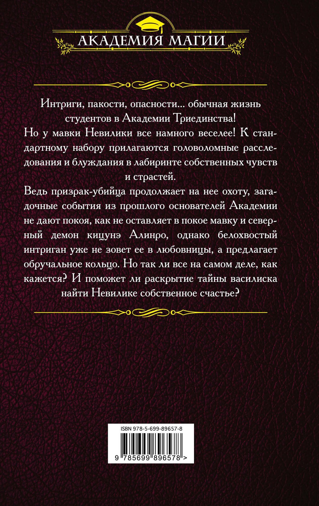 Ведь призрак-убийца продолжает на нее охоту, загадочные события из прошлого основателей Академии не дают покоя, как не оставляет в покое мавку и северный демон кицунэ Алинро, однако белохвостый интриган уже не зовет ее в любовницы, а предлагает обручальное кольцо. Но так ли все на самом деле, как кажется? И поможет ли раскрытие тайны василиска найти Невилике собственное счастье?