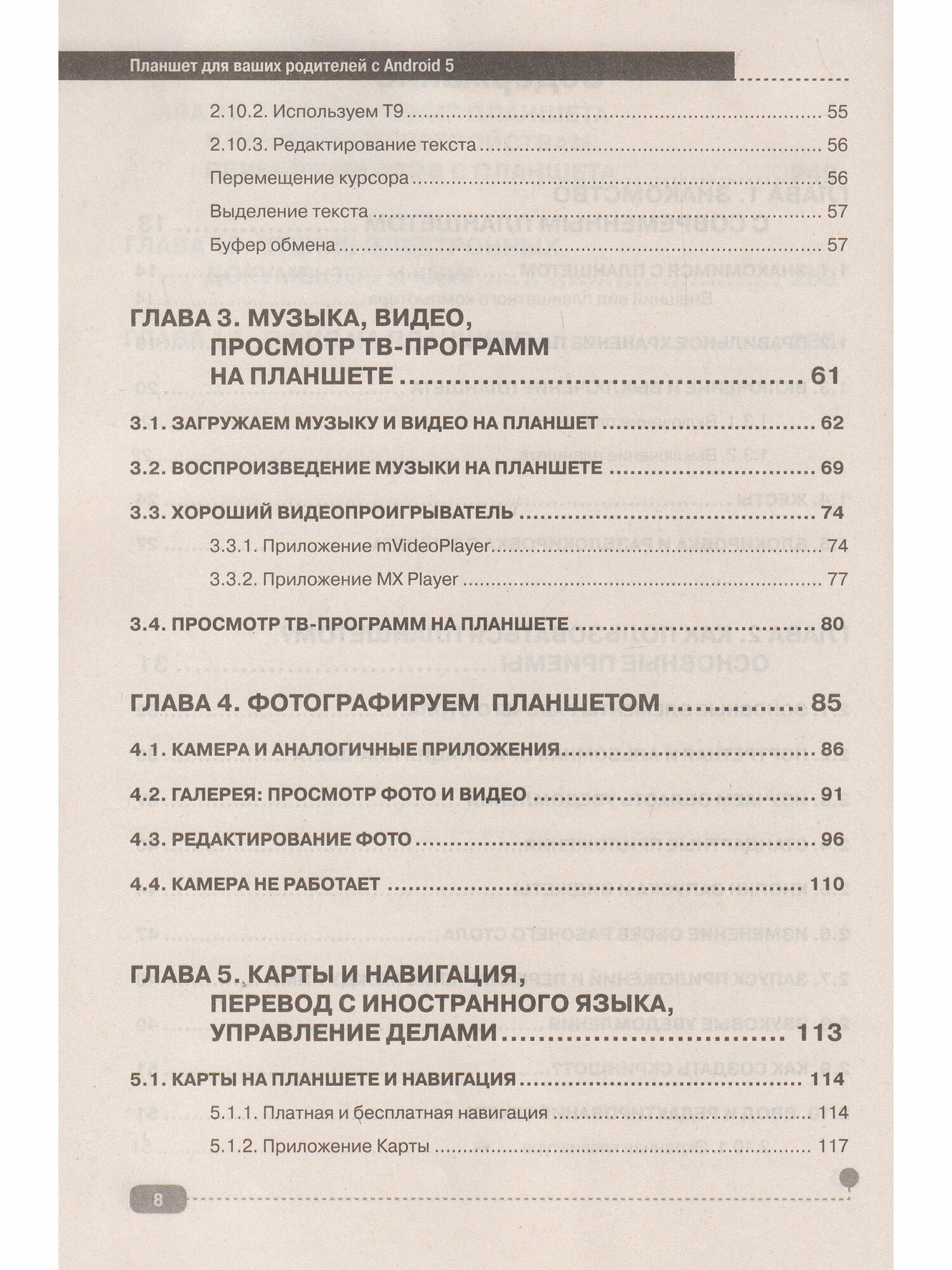 Данная книга является отличным самоучителем работы с планшетом, работающим на базе Android 5. Самоучитель написан в простой и дружелюбной форме. Изложение ведется последовательно, с пошаговыми инструкциями и наглядными иллюстрациями. Используется много подзаголовков, благодаря чему можно быстро найти ответ на нужный вопрос. В книге использована специальная верстка и увеличенный шрифт, что позволяет сделать обучение более удобным и эффективным.В этой книге можно найти информацию о том, как пользоваться планшетом, описание как стандартных действий, так и специальных, но очень востребованных пользователями: чтение электронных книг, фильмы, музыка, цифровые фотоснимки с помощью планшета, Интернет, телефонная и видеосвязь с помощью Скайпа (Skype), а также многое другое. Отдельная глава посвящена возможностям работы с документами на планшете.В данной книге собрано все самое необходимое. При этом она удобно структурирована. В результате ее можно не только читать от и до, как обычную книгу, но и просто находить ответ на нужный вопрос: как сделать то или иное действие на планшете.