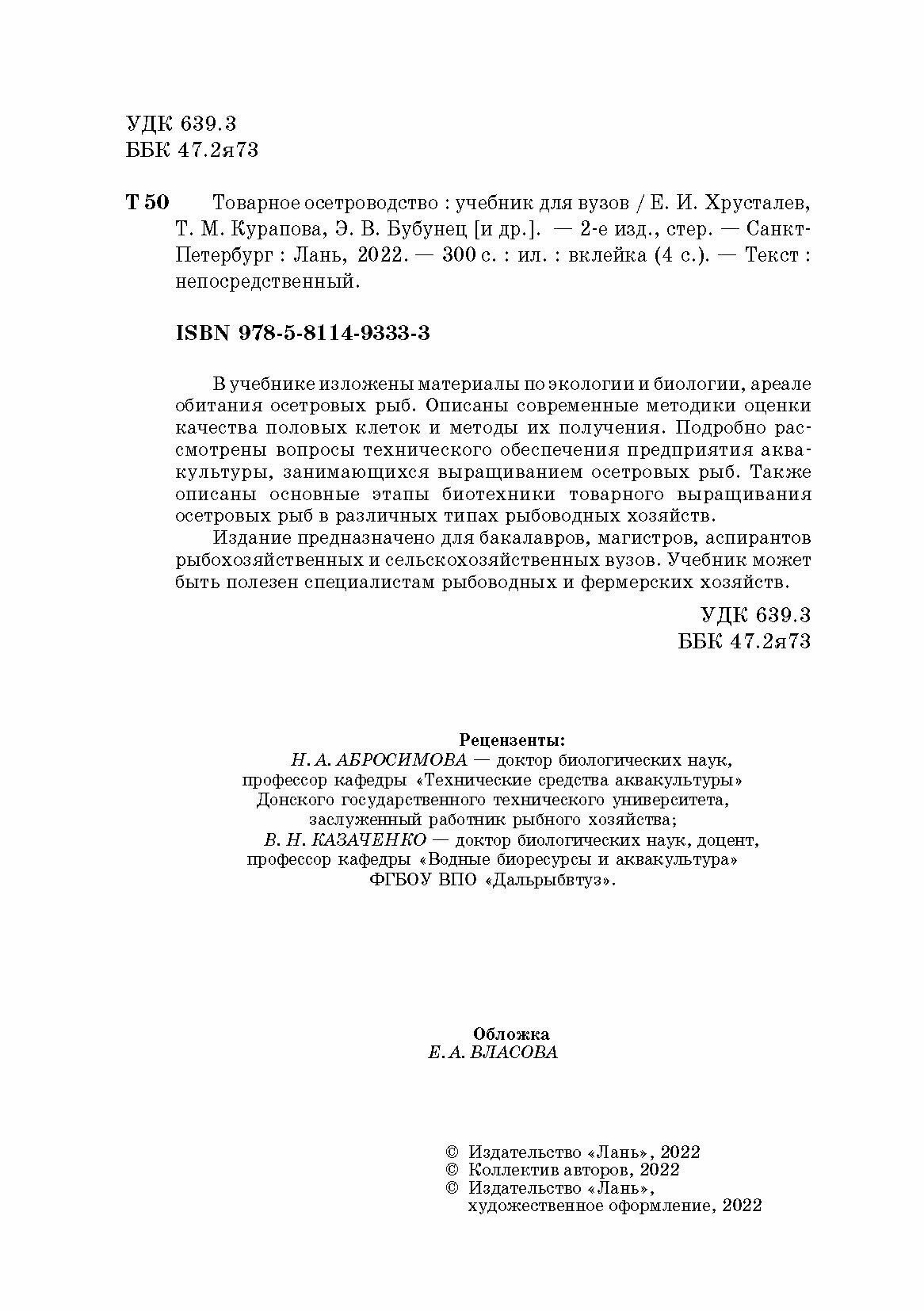 Товарное осетроводство. Учебник (Хрусталев Евгений Иванович, Курапова Татьяна Михайловна, Бубунец Эдуард Владимирович); Лань, 2016