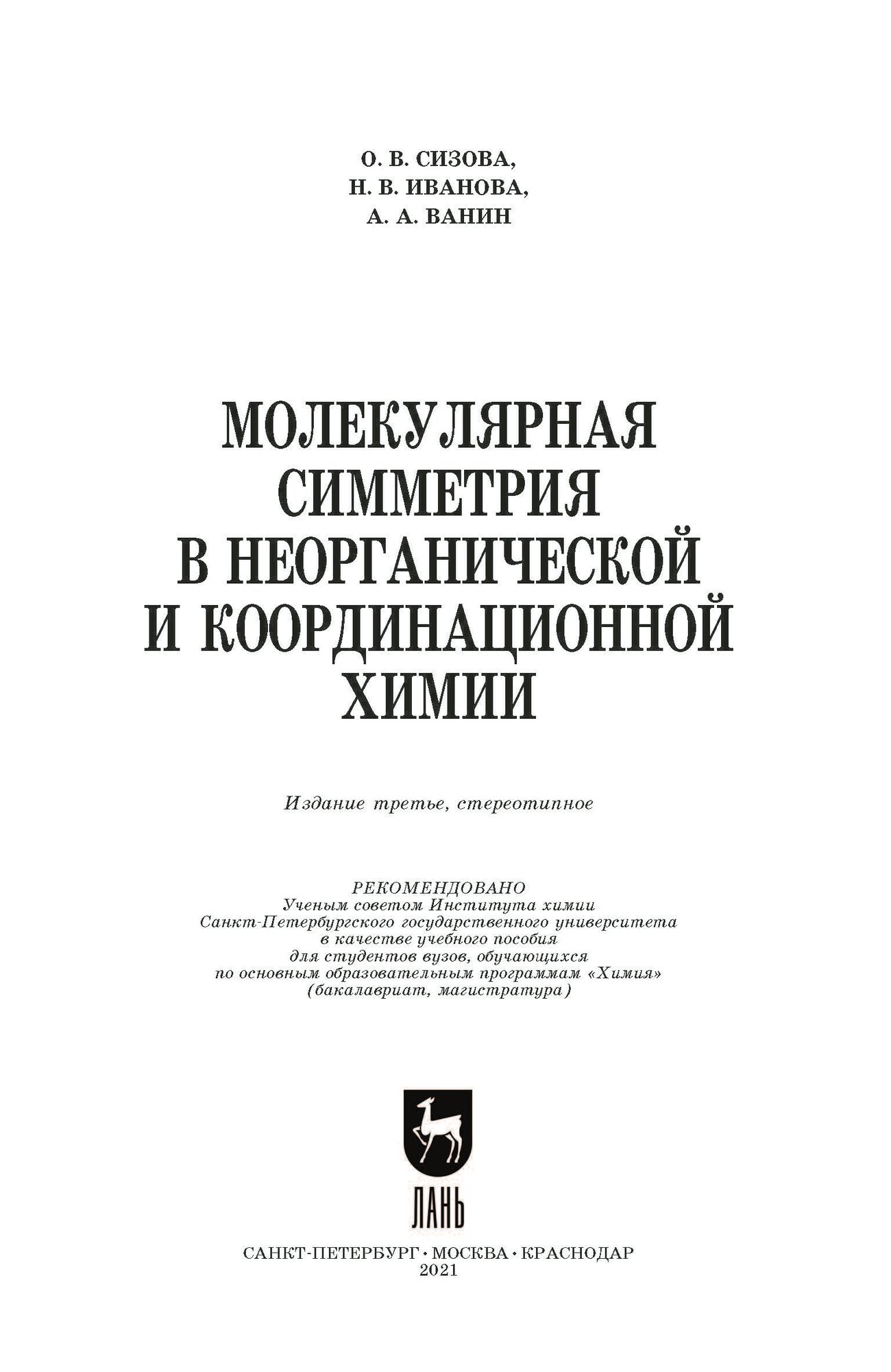 Молекулярная симметрия в неорганической и координационной химии (Сизова Ольга Вдладимировна, Иванова Нина Владимировна, Ванин Александр Александрович); Лань, 2021