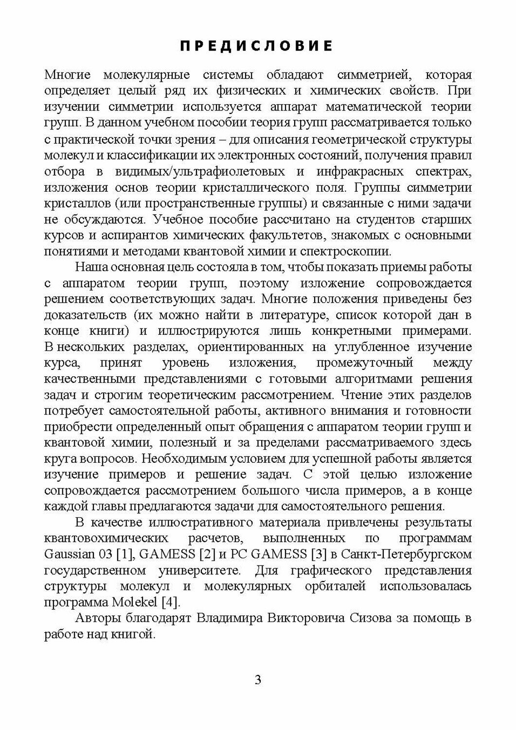 Рекомендовано Ученым советом Института химии Санкт-Петербургского государственного университета в качестве учебного пособия для студентов вузов, обучающихся по основным образовательным программам "Химия" (бакалавриат, магистратура). Изложены основы теоретико-группового анализа геометрического и электронного строения молекулярных систем. Даны необходимые вводные сведения из теории групп. Аппарат теории групп рассматривается как основа классификации электронных состояний молекул. Рассмотрено приложение теоретико-групповых методов к задачам колебательной и электронной спектроскопии. Показана роль этих методов в теории кристаллического поля. Особое внимание уделено прикладным вопросам, многочисленные примеры позволяют не только познакомиться с общими представлениями, но и научиться пользоваться излагаемым материалом. В конце каждой главы предлагаются задачи для самостоятельной работы.