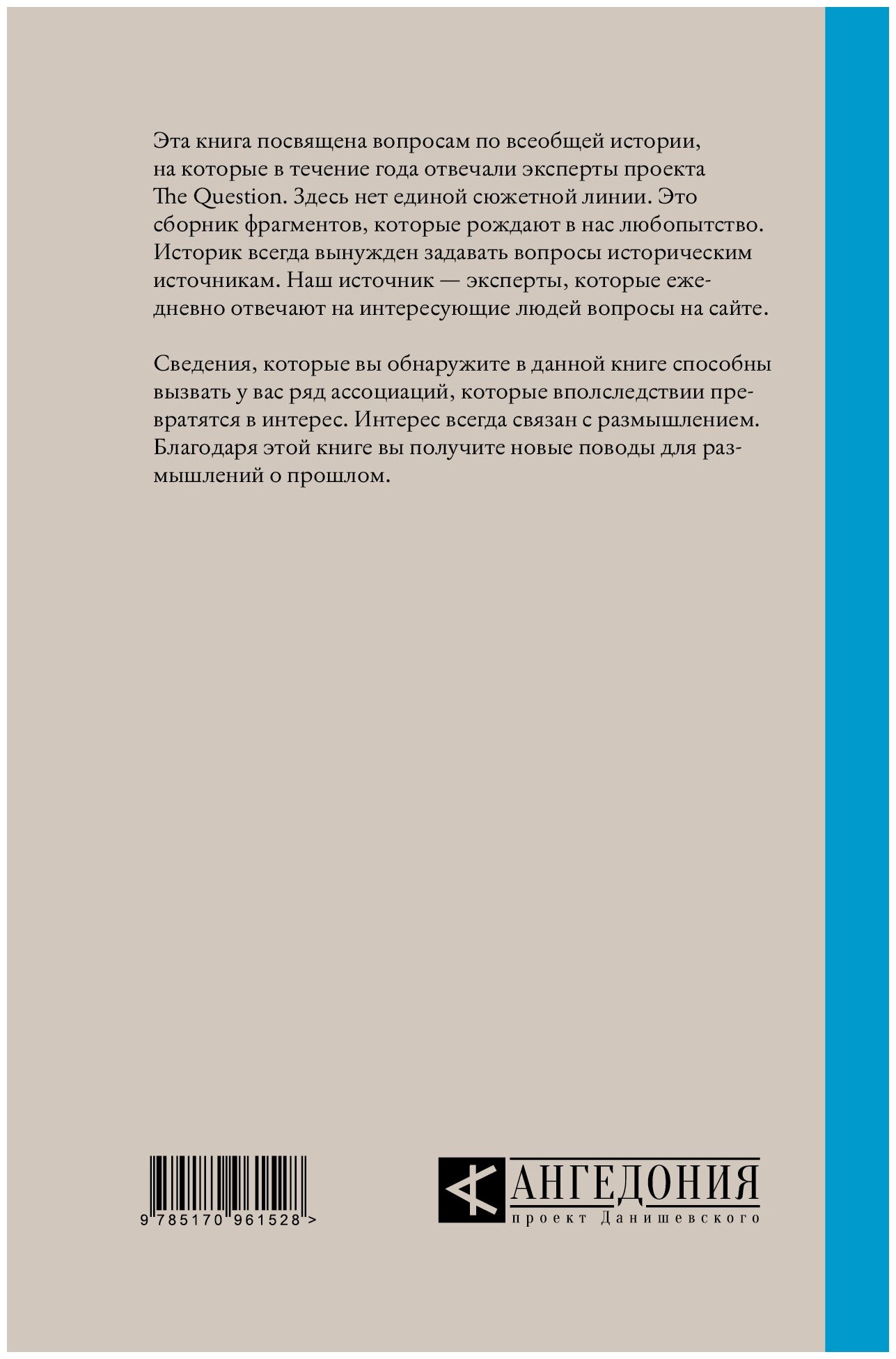 Эта книга посвящена вопросам по всеобщей истории, на которые в течение года отвечали эксперты проекта The Question. Здесь нет единой сюжетной линии. Это сборник фрагментов, которые рождают в нас любопытство. Историк всегда вынуждает задавать вопросы историческим источникам. Наш источник - эксперты, которые ежедневно отвечают на интересующие людей вопросы на сайте. Сведения, которые вы обнаружите в данной книге, способны вызвать у вас ряд ассоциаций, которые впоследствии превратятся в интерес. Интерес всегда связан с размышлением. Благодаря этой книге вы получите новые поводы для размышления о прошлом.