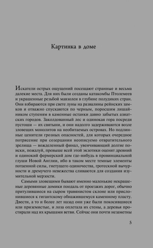 Книгу купила уже довольно давно, но прочитала буквально на днях: стояла она у меня в очереди, как собственно, и сам Лавкрафт, знакомый мне скорее по аллюзиям Геймана. Что могу констатировать несомненно: именно страх и именно затаившийся. Стилистика близка к По, девятнадцатый век в полной красе неторопливости, но скажу честно - после пары первых рассказов предпочитала читать, когда дома не одна. Неуютно. Но бросить - никак.