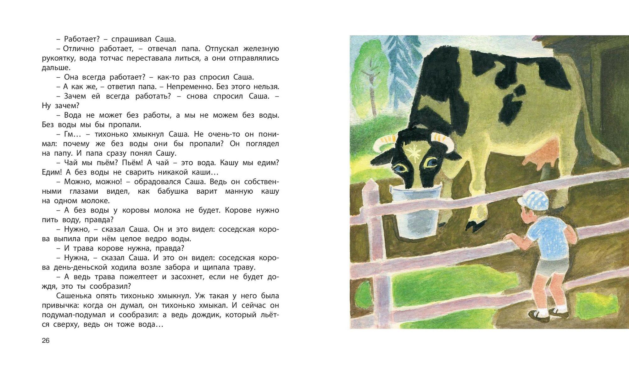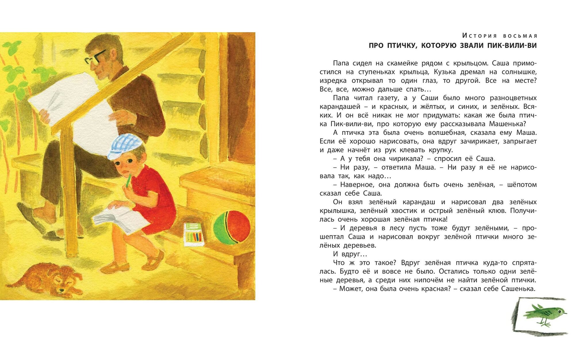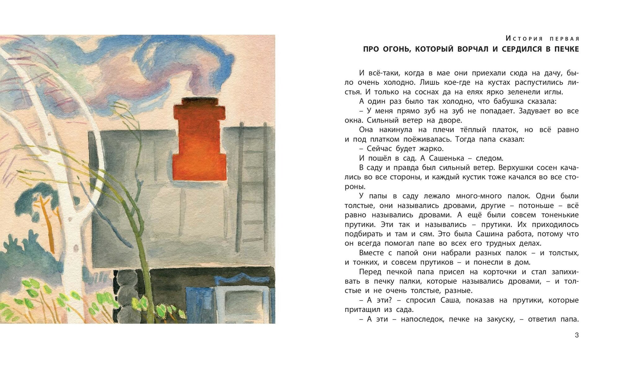 Одиннадцать интересных историй о мальчике Саше и его семье. Действие происходит на даче, где живет семья: папа, мама, бабушка, старшая сестренка Маша и младший братик Саша. Истории простые, понятные ребенку. Взаимоотношения в этой семье очень-очень теплые, добрые, настоящие. Нет грубости, ругательств, так часто встречающихся в современных книжках. Всю книгу пронизывает любовь к детям, к природе. Есть и мораль, но тонкая, не навязчивая. Очень добрая и нужная книга.