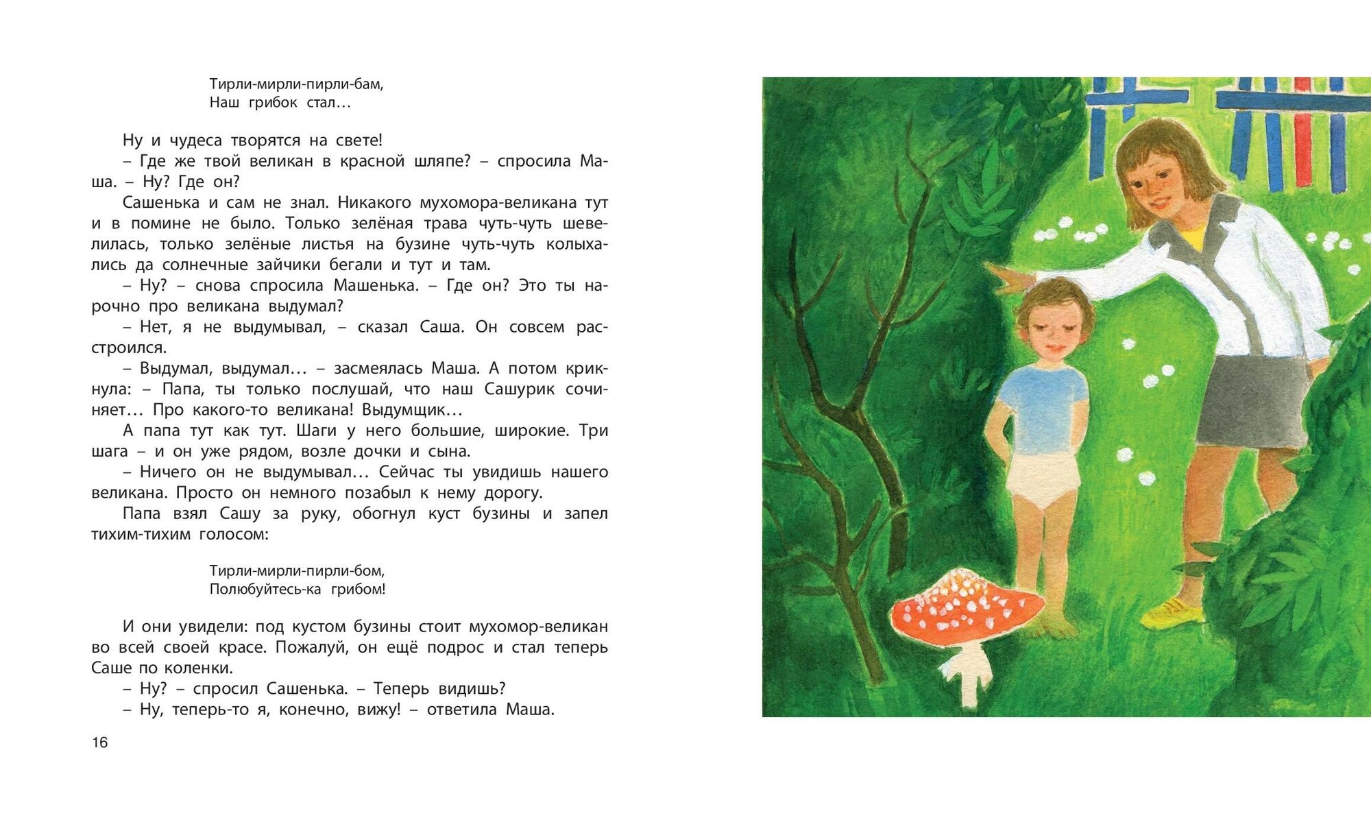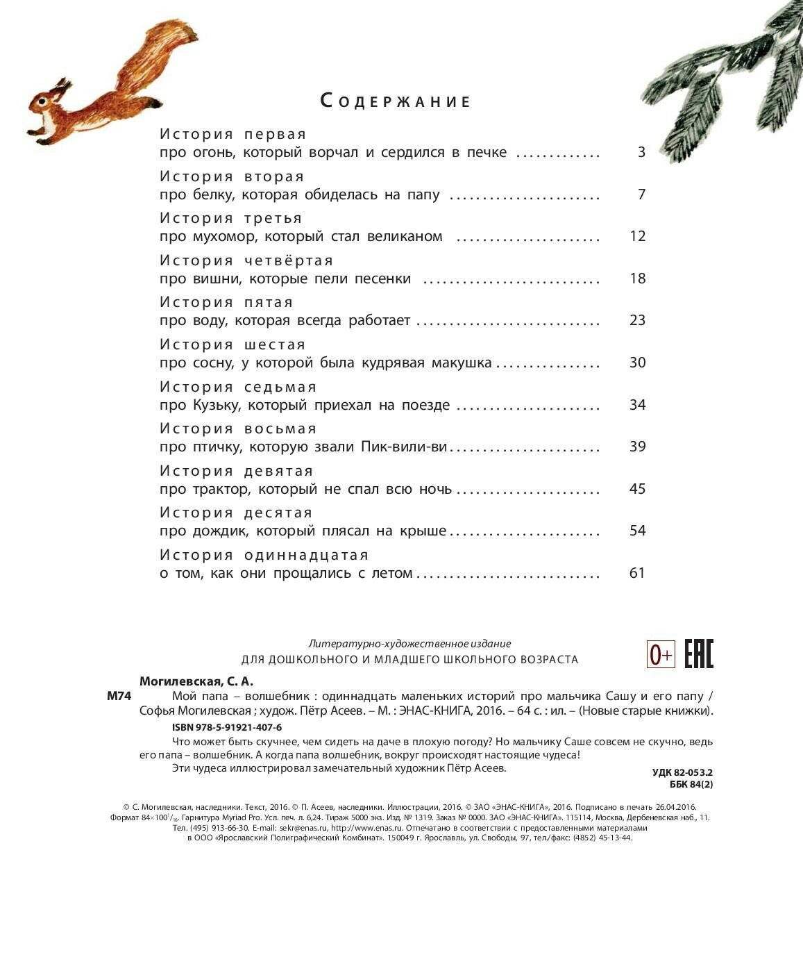 В книжке Софьи Могилевской - одиннадцать историй про Сашу и его папу - про белку, которая умеет обижаться, и про мухомора-великана, и про поющие вишни, и про многое другое.