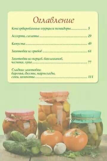 Небольшая, но очень полезная кулинарная книжка про все заготовки. Сладкие, солёные, острые, зелёные, рыбные, мясные, из грибов и ягод. Много всего. Сразу даже и не перечислить. Но всё можно приготовить с помощью этой книги! Очень рекомендую всем любителям домашней кулинарии и домашних заготовок.